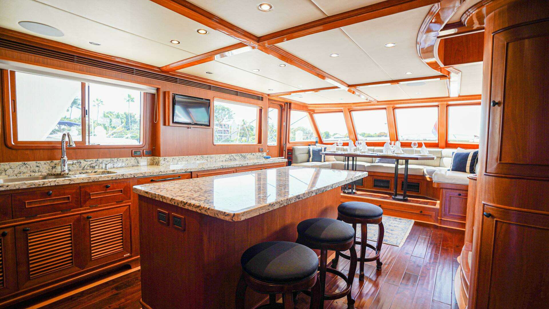 Entering the main salon through the sliding glass doors, you’re immediately struck by the craftsmanship and attention to detail, from the custom bar area with a built-in glass curio cabinet and abundant storage to the dual overhead cherry handrails and high-gloss burl countertops that beautifully complement the custom furnishings. The hand-scraped walnut flooring throughout enhances the yacht’s refined and timeless aesthetic.