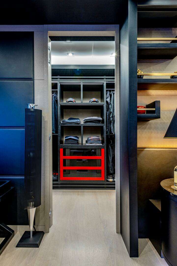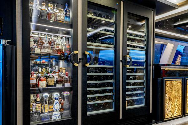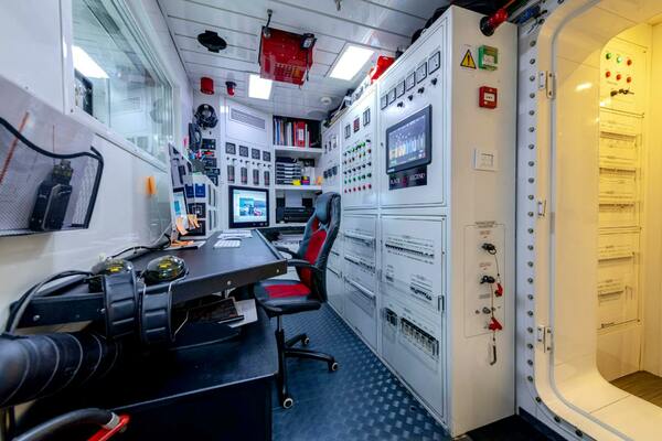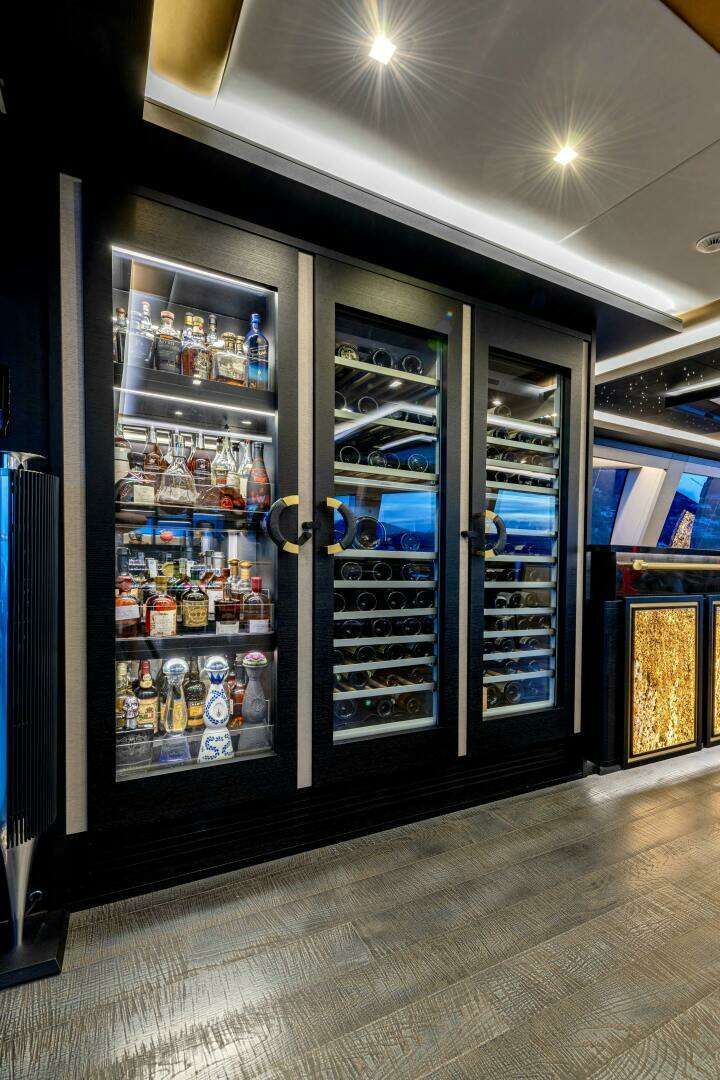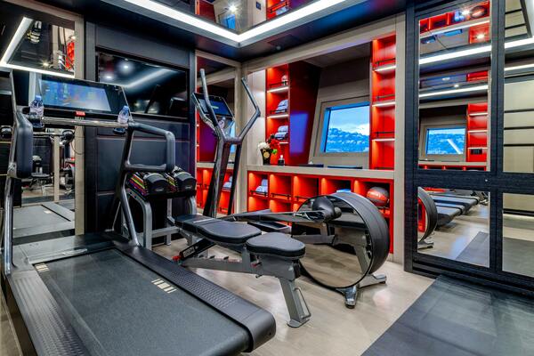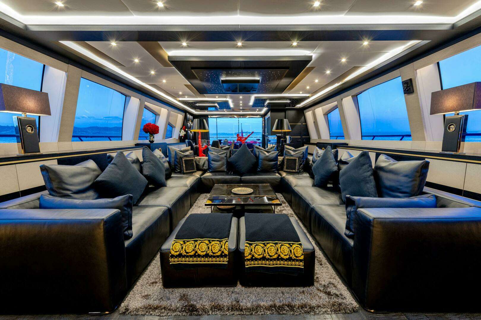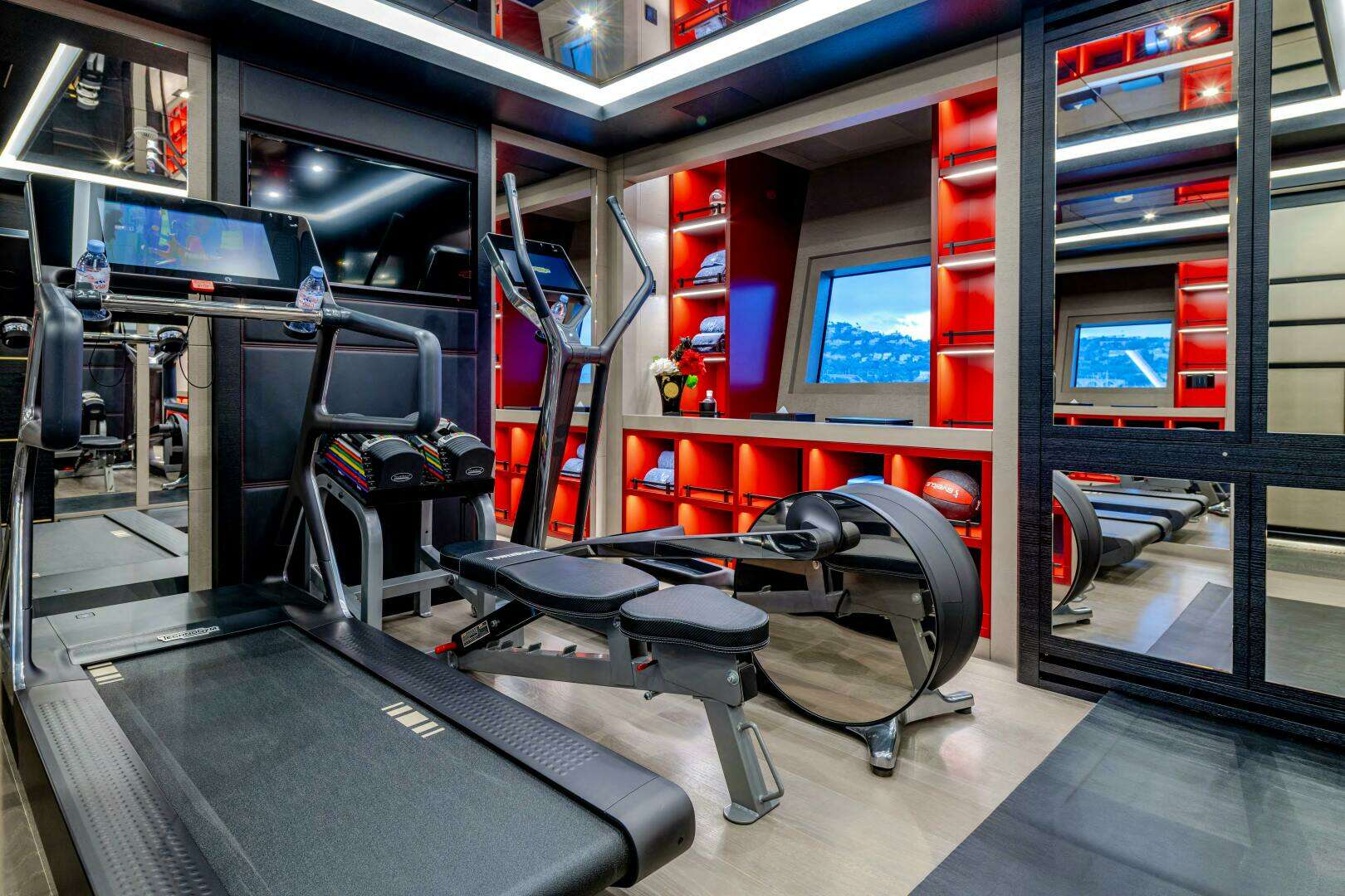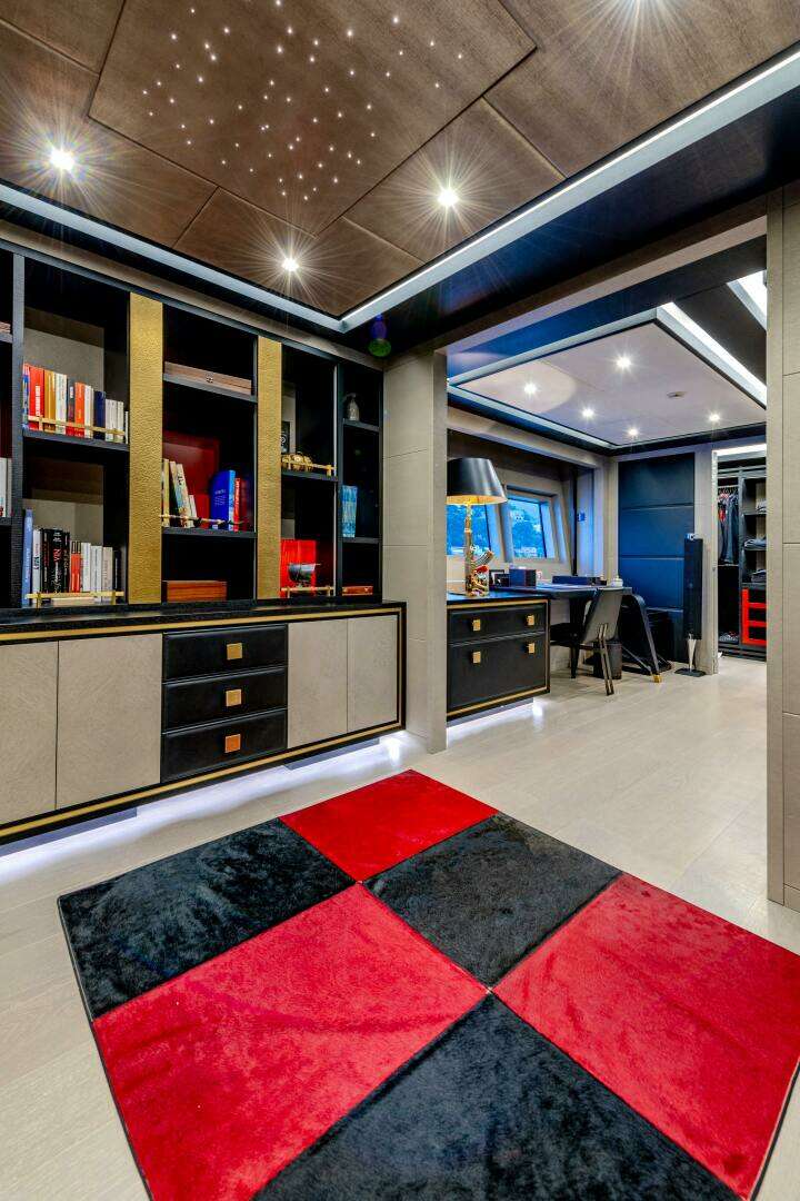 On the lower deck, a full-beam master suite with a private office and dressing room is complemented by a gym, cinema, and three further guest cabins, including a VIP. The cinema room can be converted to sleep a further two guests if required, bringing the total guest accommodations up to 10.
