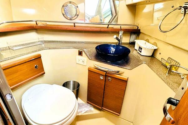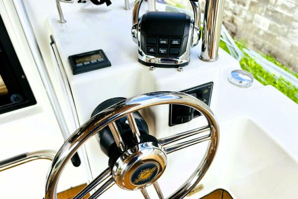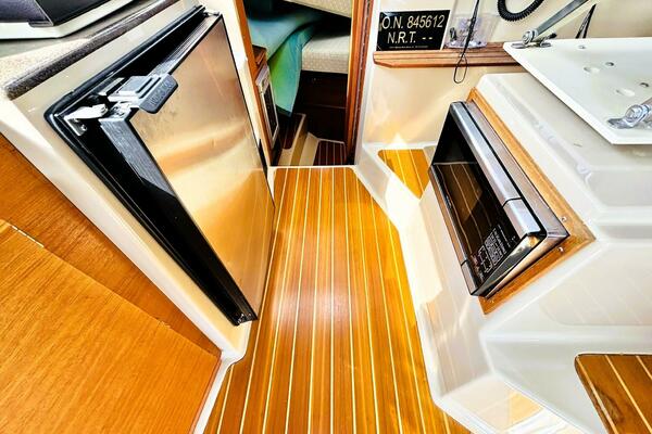 The interior has been thoughtfully arranged to maximize livability. A forward island berth, midship berth, convertible dinette, and enclosed head with shower allow up to six adults to sleep comfortably, making this boat ideal for families or cruising couples hosting guests. The galley, complete with propane stove/oven, refrigerator, microwave, and wine cooler, ensures onboard meals are as convenient as at home. On deck, the reversible cockpit seating, teak table, and integrated swim platform extend the living space outdoors for entertaining or relaxing at anchor.