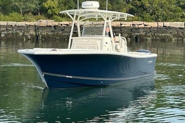 RESOLUTE, is a great example of a well equipped 31 Regulator FS, featuring the Flag Blue Hull, full Garmin Package, Powder Coat Package, Cockpit Engine Flush, Sun Bed Table, New Forward Cushions, and more.