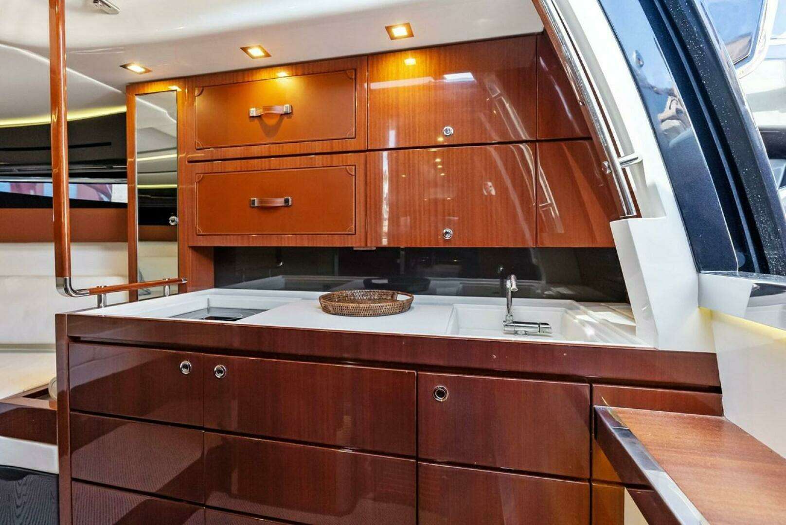 - Varnished fiberglass helm station with carbon panels and upholstered areas with covered steering wheel, magnetic compass, various controls and alarm lights