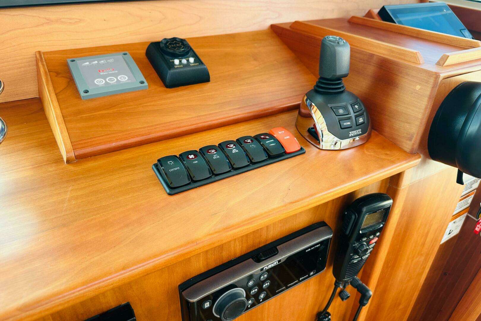 - Fusion Black Box System with Bluetooth. Remote controls at helm and cockpit. 4 speakers, 2 in main salon, 2 in cockpit. NOTE: This stereo does not have a DVD/CD player.
