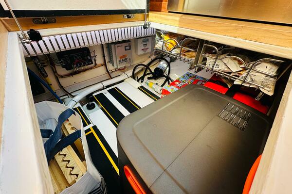 - Large cedar lined hanging locker to port, with louvered door, shelf and hangar pole