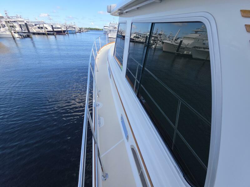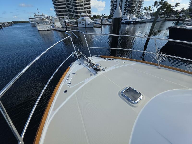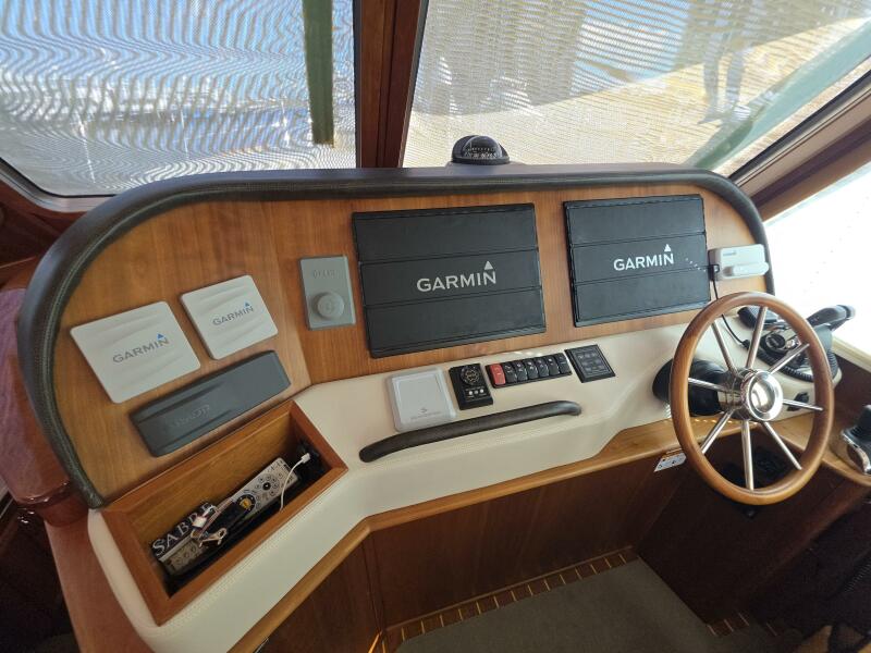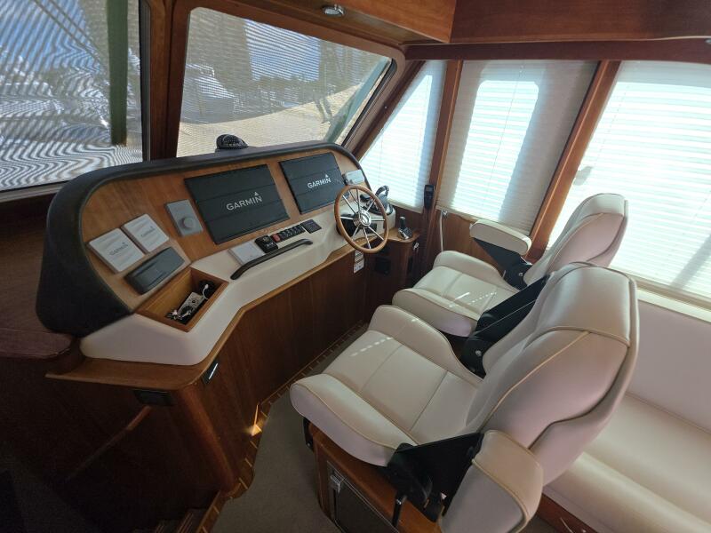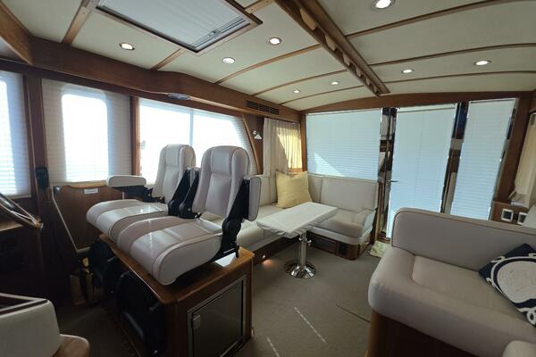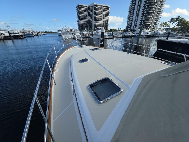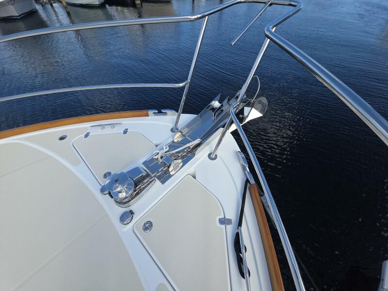 The 48's traditional exterior profile belies the contemporary performances of her vee-hull. She cruises at 27 knots and at wide open throttle she'll attain more than 32 knots. With the Zeus pod drive system, turns at speed are as exciting as they are in a fine sports car but perhaps even more exhilarating is the quiet that one experiences at cruise speeds. Less than 75 Dba makes her one of the quietest motoryachts available today. The joystick and Skyhook operations give every Captain the confidence to dock her in the most difficult of circumstances.