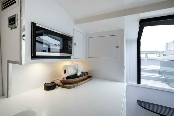 - Refrigerator, sink and hot plate hidden under seat cushion