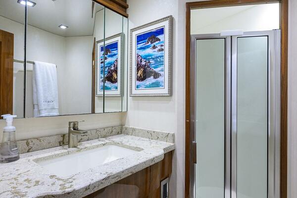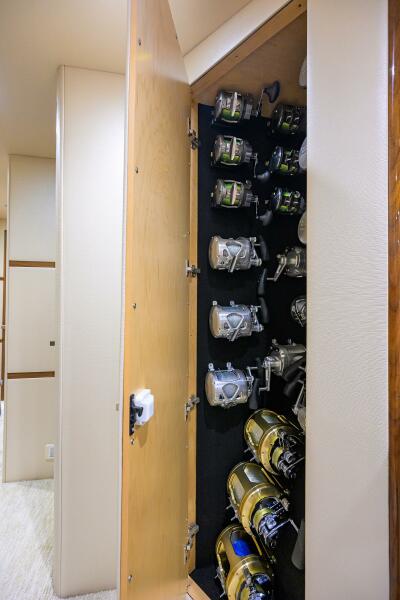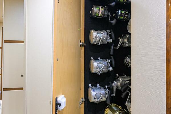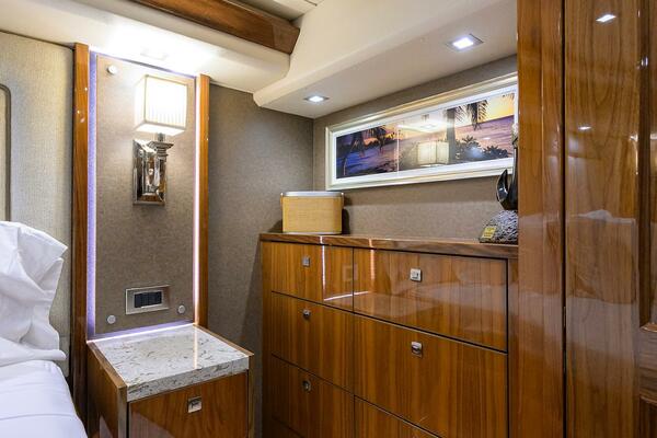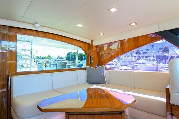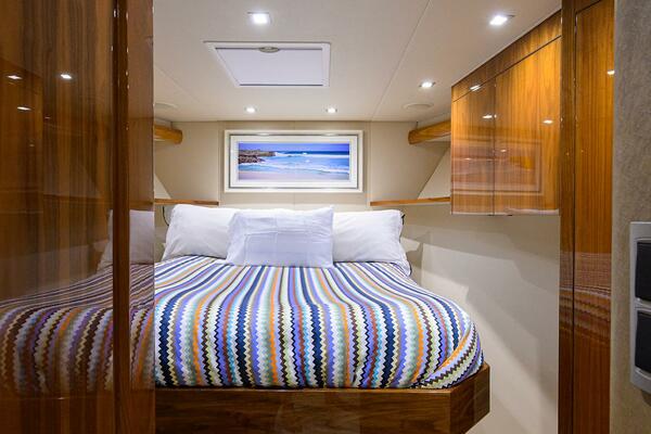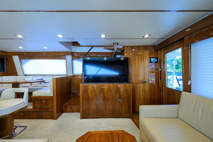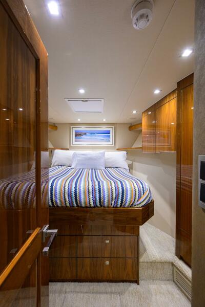 The interior showcases Viking’s signature walnut gloss finish with custom décor throughout, including custom Amtico flooring, brushed nickel hardware, upgraded mattresses, custom countertops, and abundant storage. Multiple social areas- the salon, dinette, enclosed bridge, mezzanine, and cockpit- make TORTA perfectly suited for extended fishing trips or relaxed cruising with guests.