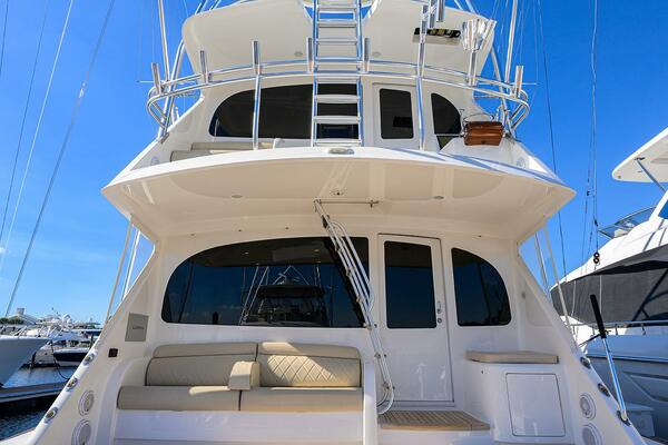 Designed for serious offshore programs, TORTA is equipped with a SeaKeeper SK26, Eskimo ice machine, watermaker, upgraded chill plates, hydraulic outriggers, and a comprehensive electronics package from Garmin, Furuno, FLIR, and Atlantic Marine Electronics across the enclosed bridge, aft station, and tower. The mezzanine features Viking’s Cool Breeze A/C system for enhanced comfort during warm tournament days, while the enclosed bridge doubles as a climate-controlled second salon with premium seating and full helm redundancy.