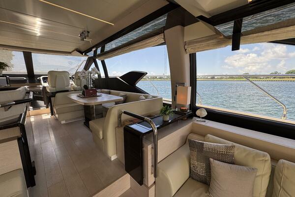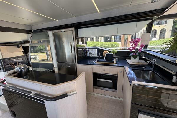 Step aboard and you’ll immediately notice the massive flybridge—one of the largest in its class—offering plenty of space to enjoy the sun, dine with friends, or simply take in the view. Inside, the salon is bright and airy, with oversized windows and elegant finishes that make it feel like a floating luxury apartment. The open-plan layout flows effortlessly from the galley to the lounge and dining areas.