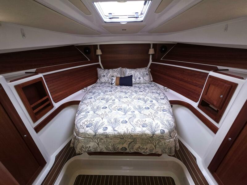 Her single-level deck from transom to companionway bring the social spaces of the cockpit and pilothouse into one, offering a beautiful and seamless transition between indoors and out. A galley-up design opposite a versatile settee and open sightlines all the way around the boat make the upper level of the Back Cove 32 ideal for entertaining or relaxing. Below, the cruising couple can enjoy a secluded oasis all their own. Featuring a spacious island berth and split head and shower units, her practical and elegant details offer unprecedented comfort when spending time on board.