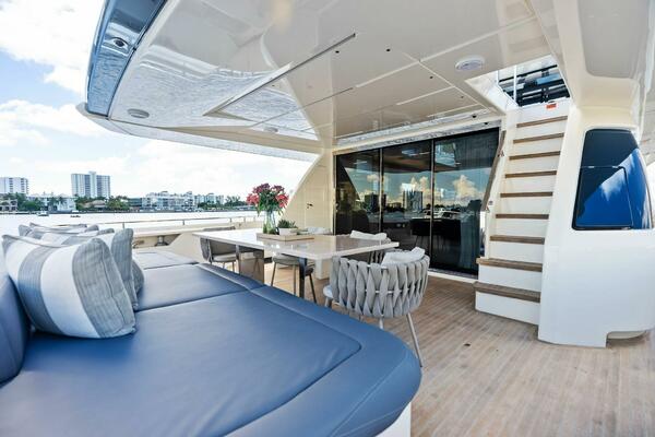 - Access to the flybridge through GRP and teak steps, stainless steel handrail