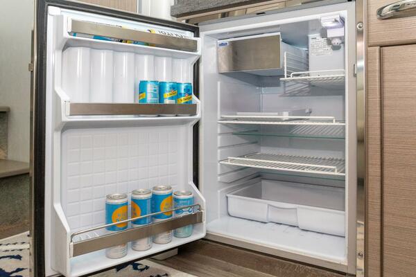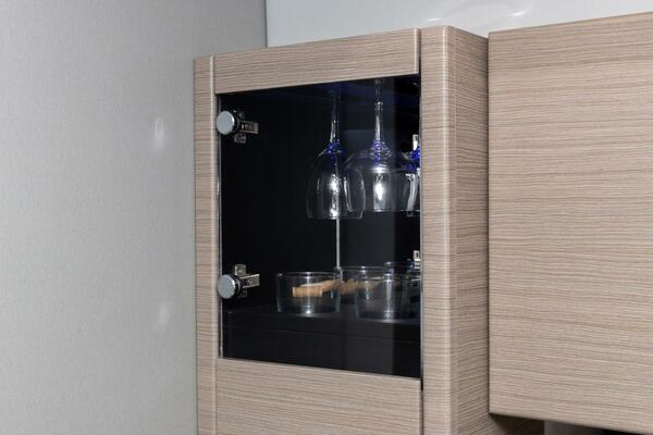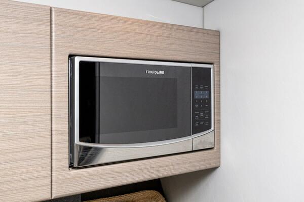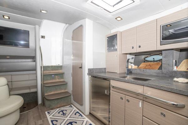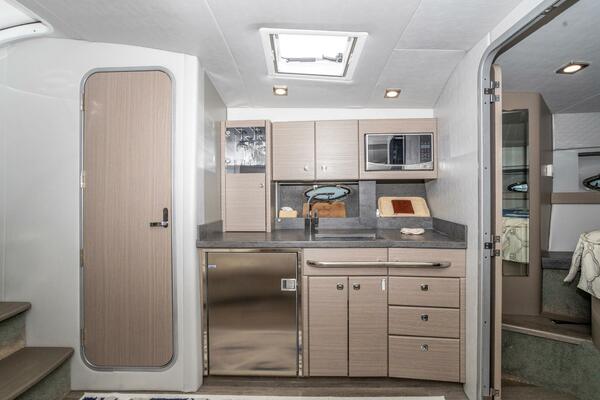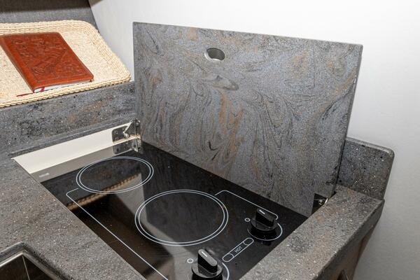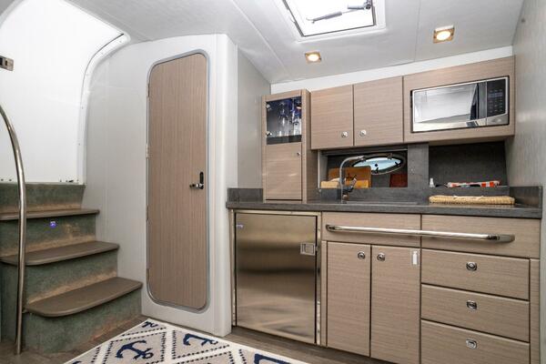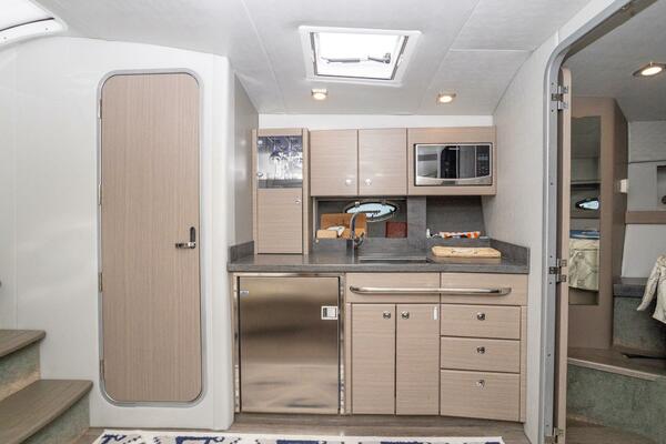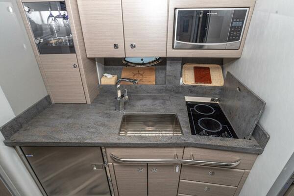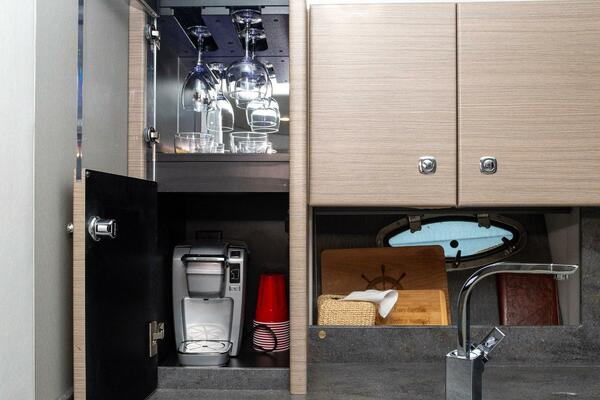 - Complete galley in high-gloss Deep Cherry finish with storage and hardwood dovetailed drawers, full Corian countertop, beverage center, polished stainless steel sink, concealed 2-Burner electric stove with safety shut-off switch, 120V/12V stainless steel refrigerator polished stainless steel microwave oven, Krups® coffee maker and concealed in-counter trash container