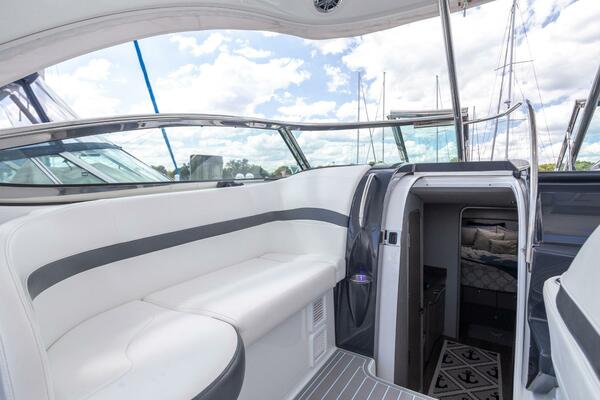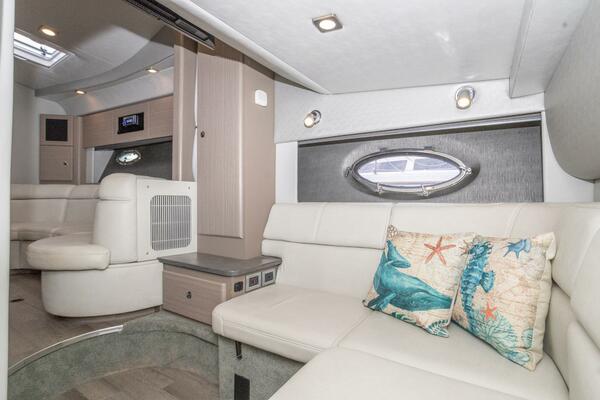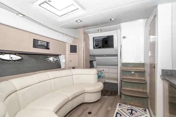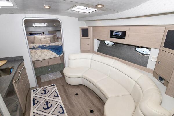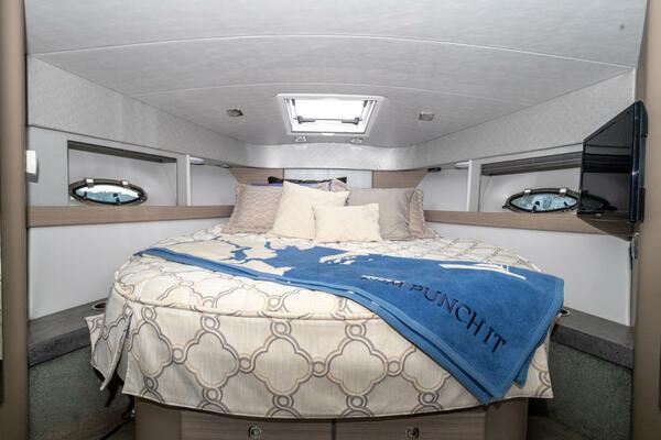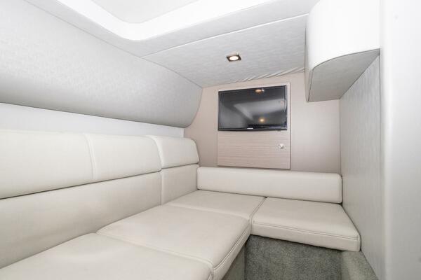 - Private forward stateroom with double high-gloss Deep Cherry finish doors, centerline bed with Sensus® memory foam mattress and stowage below