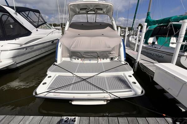 - Molded fiberglass transom trunk with pneumatic lifts, fender storage, four fenders, storage for cockpit tables and cushion