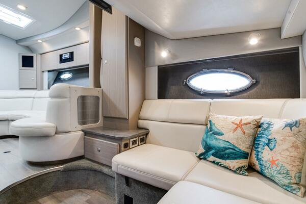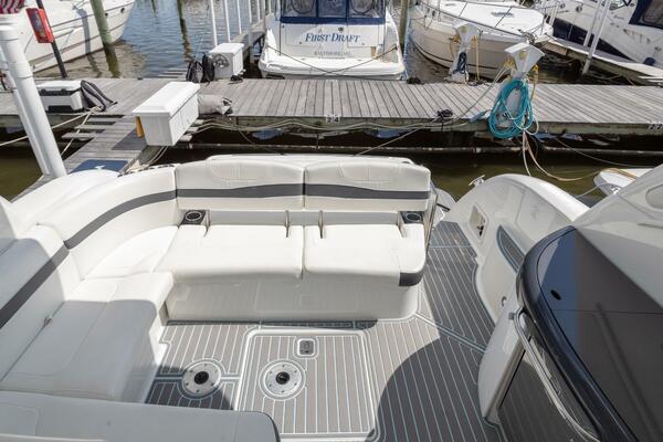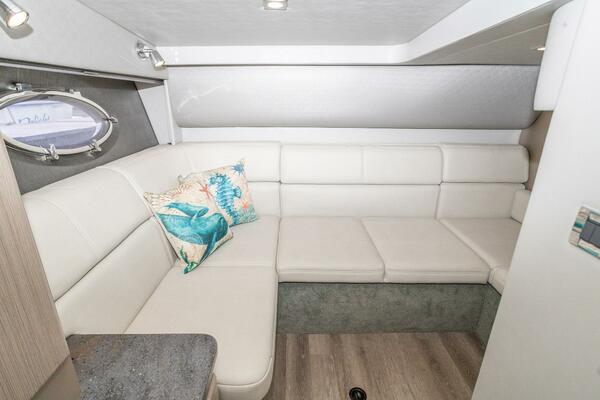 - Aft U-Shaped lounge seating with fiberglass-lined storage, two dual-height tables and sunpad inserts