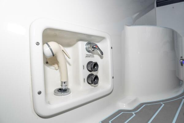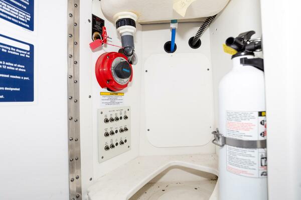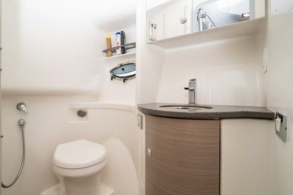 - Molded private head compartment with molded vanity and lower door in high-gloss Deep Cherry finish, Corian counter, polished stainless steel sink, Flush and Forget® VacuFlush® head unit with holding tank and dockside pumpout, separate stall shower with hinged acrylic door and exhaust fan