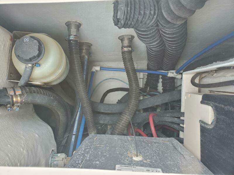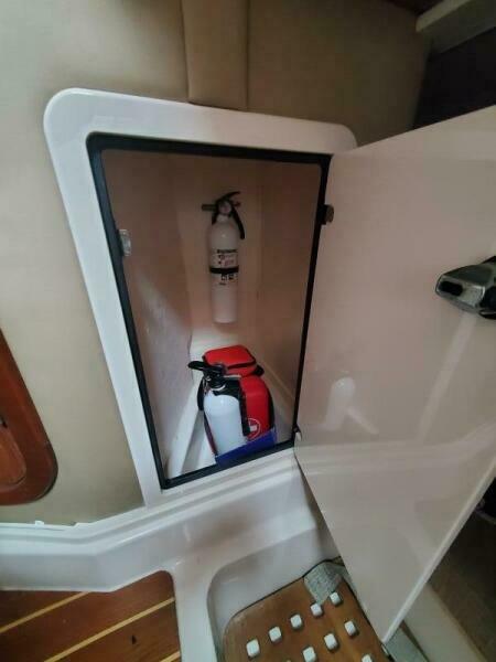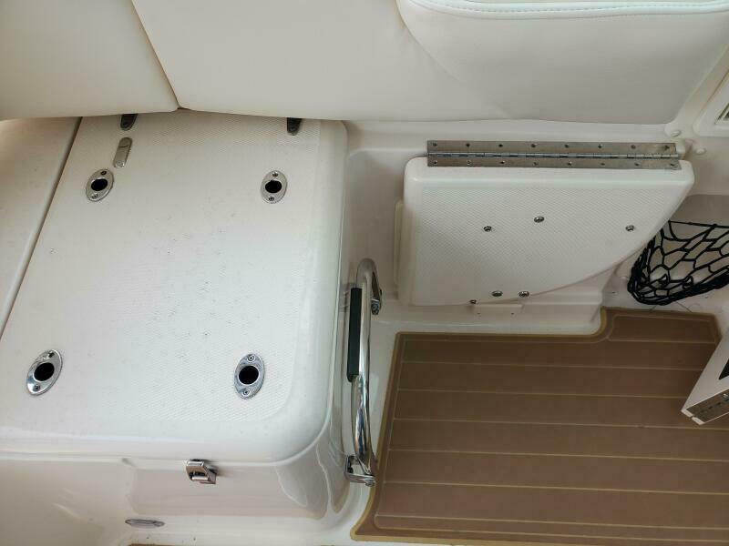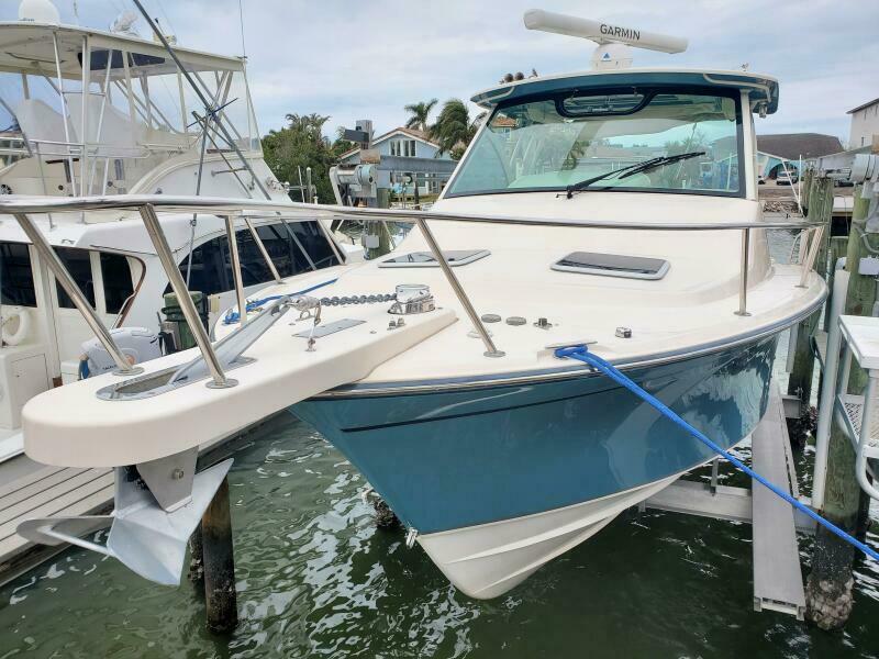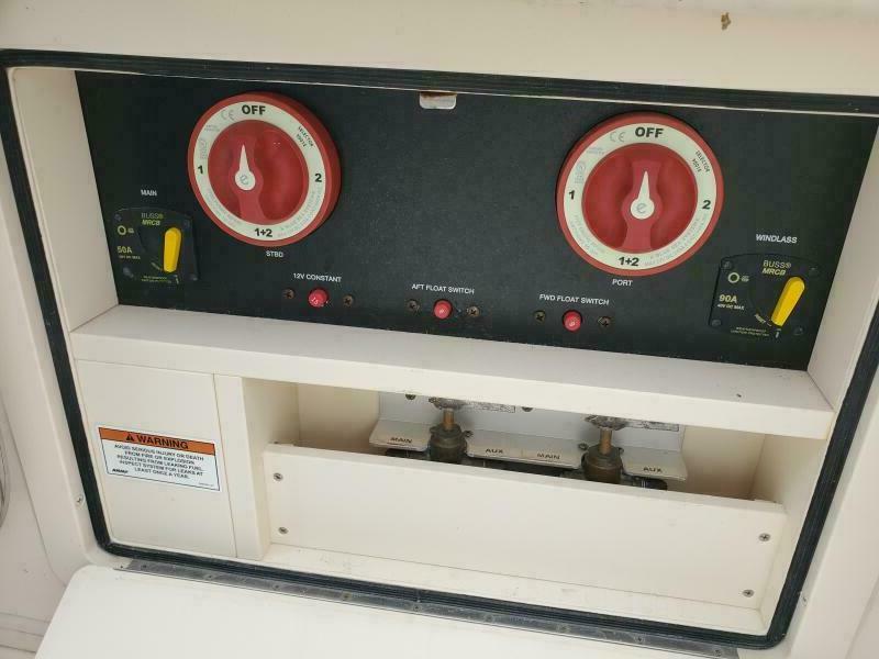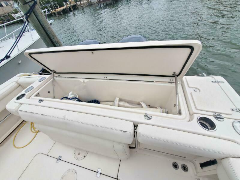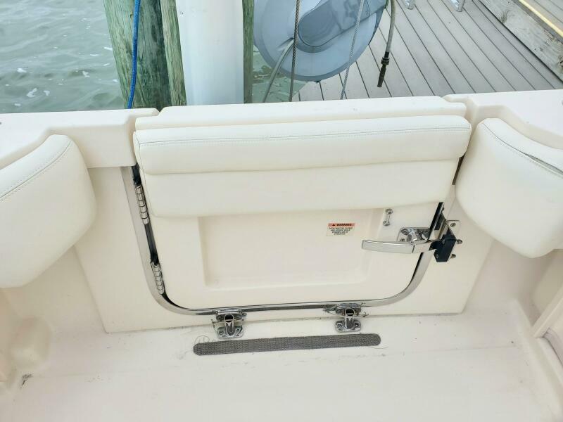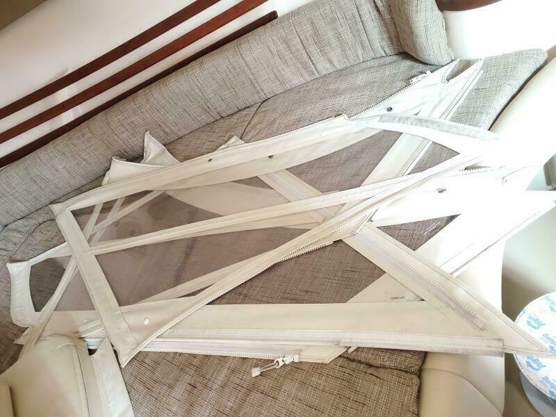 Isinglass cockpit enclosure with updated zippers and maintenance, side dive door, stainless telescoping swim ladder, fresh and saltwater washdowns, synthetic teak cockpit flooring, 50 AMP shore power, new trim tab system, new hull side paint, pin stripe logos and vent, stainless telescoping aft sun shade etc. Factory flywheel updates have been completed. Recent engine service on 9/25.