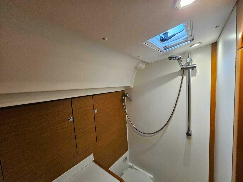 In addition to the 2 private cabins the salon table converts to a double berth. For additional comfort URKAB was ordered with an extra water tank, air conditioning, fans in the salon and all berths, shades and screens for all hatches and ports. The electrical system upgrades include an upgraded 200 amp Balmer alternator 700 watts of flexible solar panels and a LiFePO4 battery bank and 60 amp solar battery charger. You will appreciate this seaworthy sailboat, stable and responsive at the helm, and her length maneuvers with great precision in all conditions.