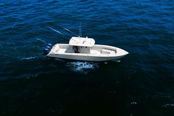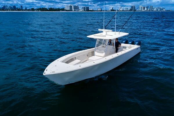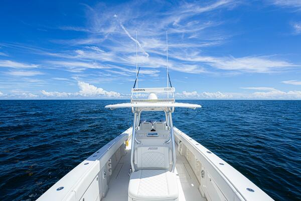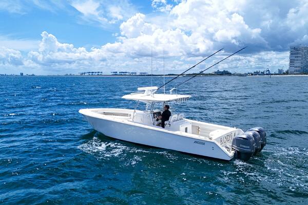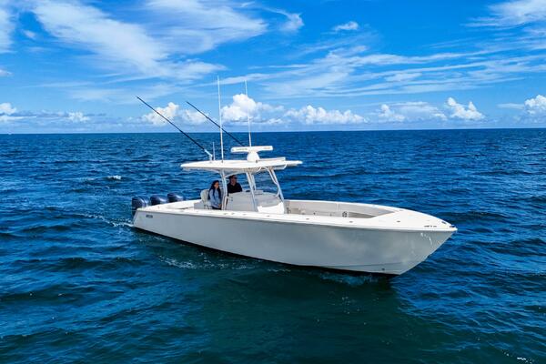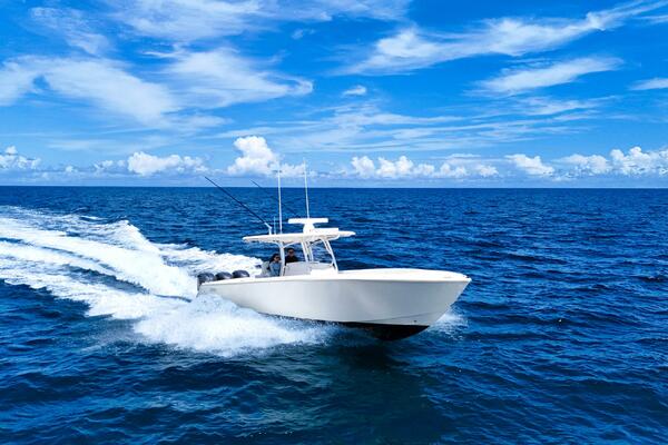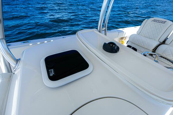 This Jupiter 38 with forward seating is new to market and won't last long! With wide beam, centerline fuel tanks, and ample freeboard, she's a stable and comfortable ride. She has the most sought after extras including Garmin multi function displays, Fusion stereo system, underwater lights, and carbon fiber outriggers!