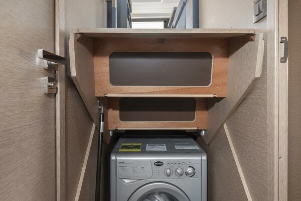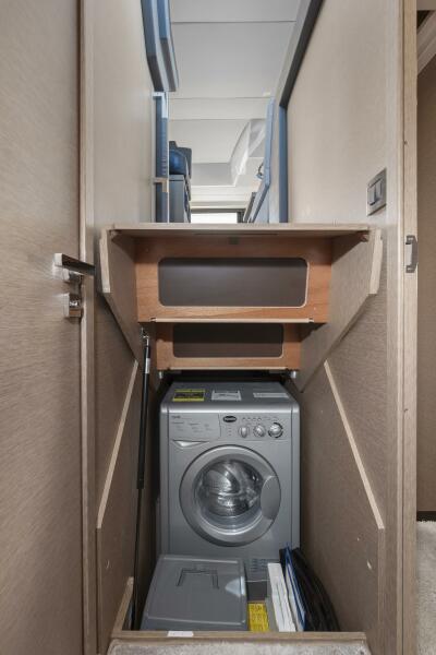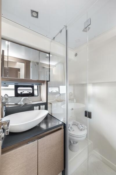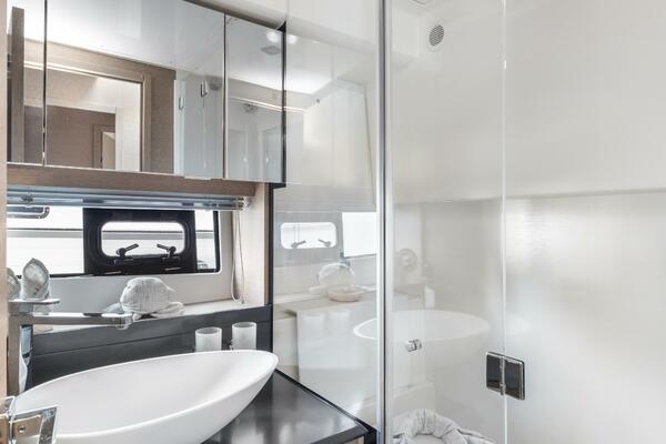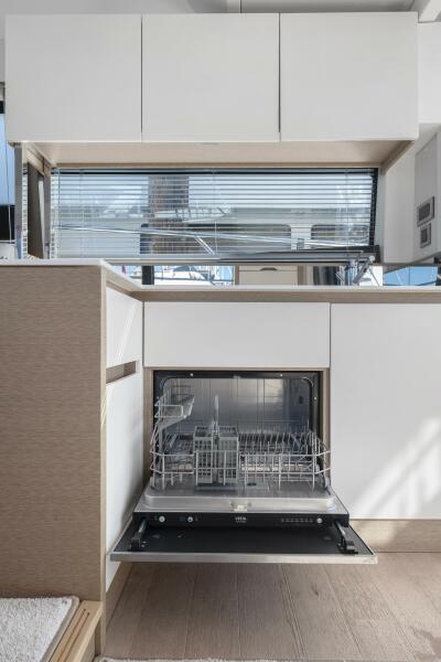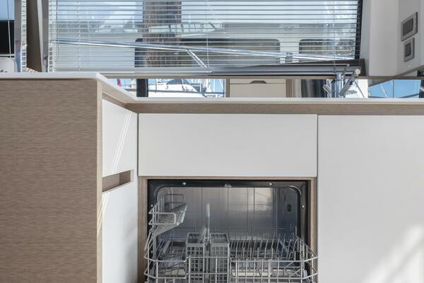 - Aft galley with full-size refrigerator, dishwasher, cooktop, microwave / convection oven, and generous storage