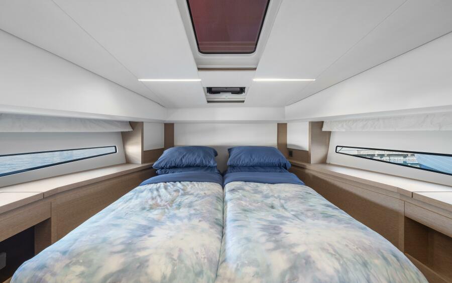 The open-plan salon and galley connect seamlessly to the cockpit, creating an inviting indoor/outdoor living area perfect for entertaining or extended cruising.