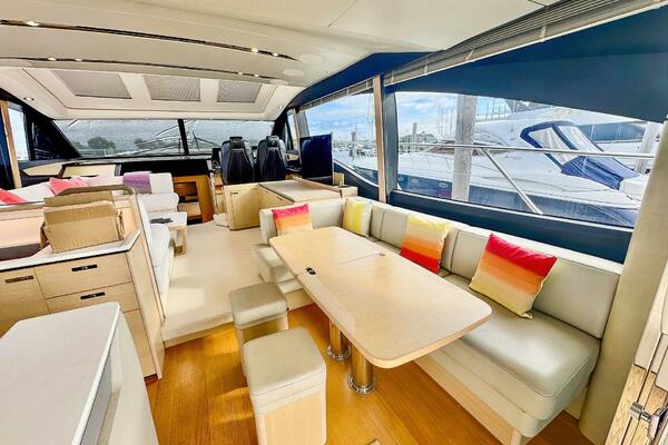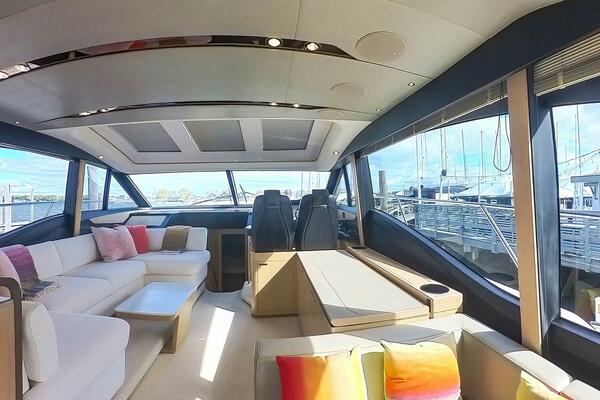 The Princess S60 seamlessly blends express yacht style with the versatility of a flybridge, offering dual helms—one climate-controlled helm station with exceptional panoramic views and a generous sunroof, plus an open-air flybridge helm with spacious lounges, wet bar, and ample seating for entertaining 7-8 guests comfortably.