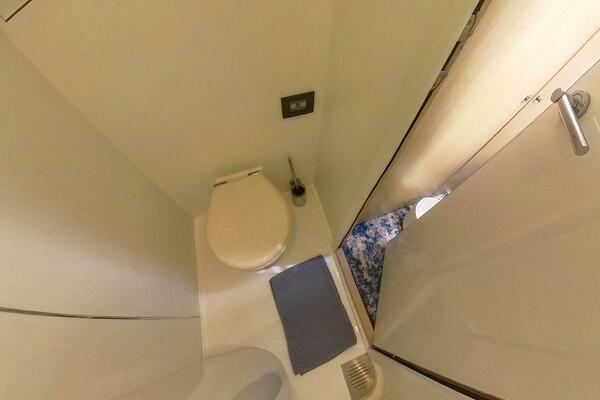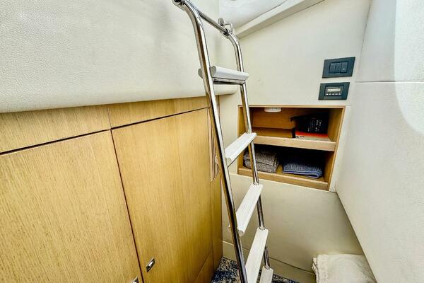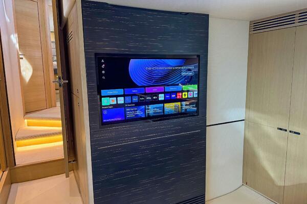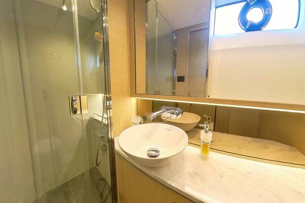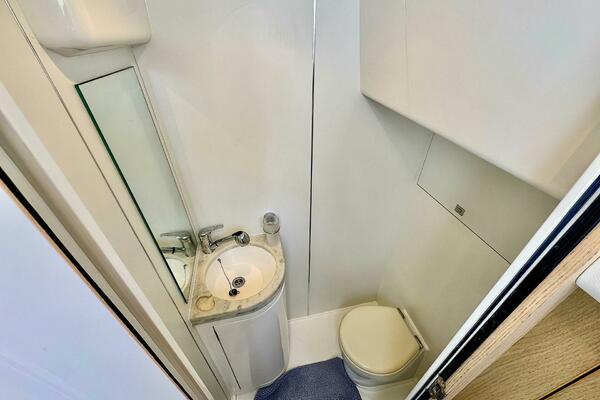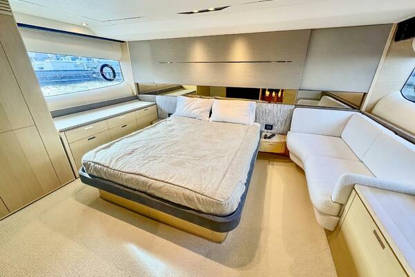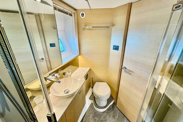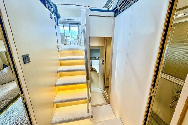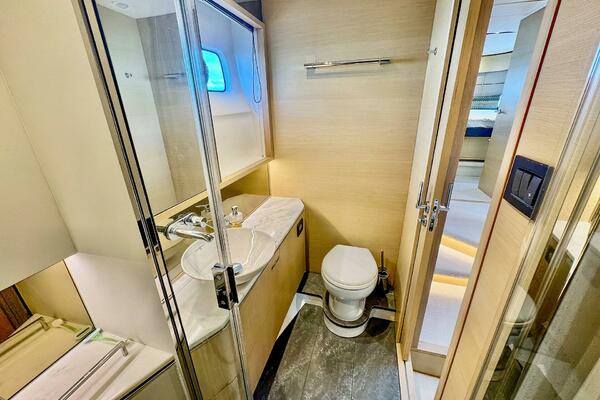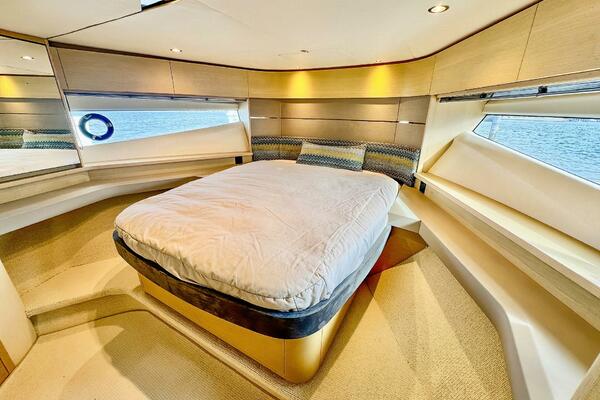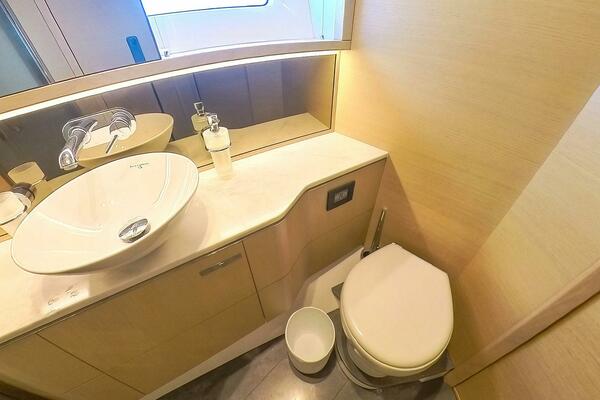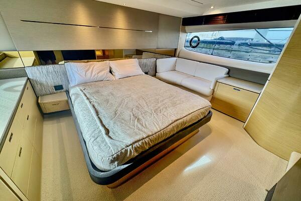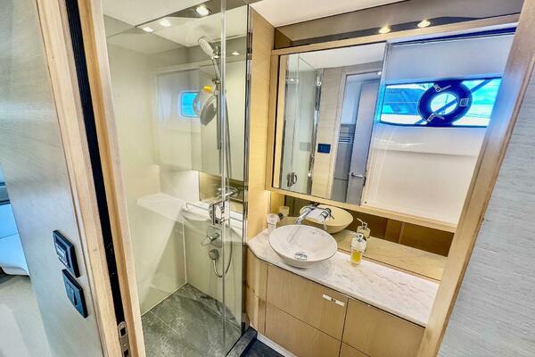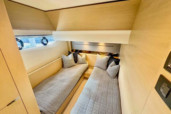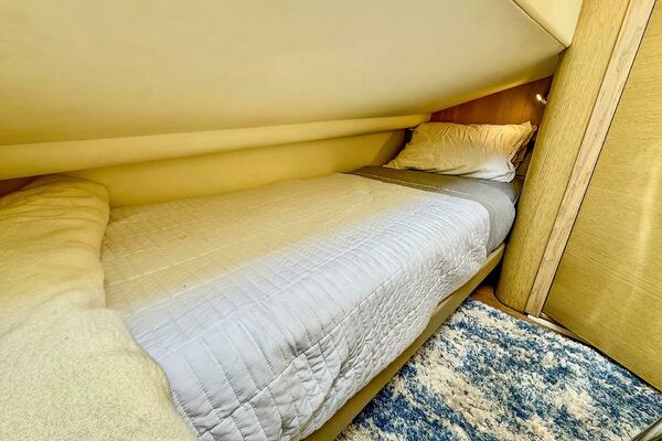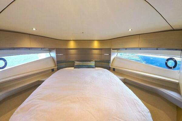 Below deck, the master suite spans the yacht’s full beam, flooded with natural light from large hull-side windows. The VIP stateroom forward features an island queen bed and ensuite bath, while the guest stateroom amidships offers comfortable twin accommodations. A dedicated crew cabin with private head access further complements this vessel.