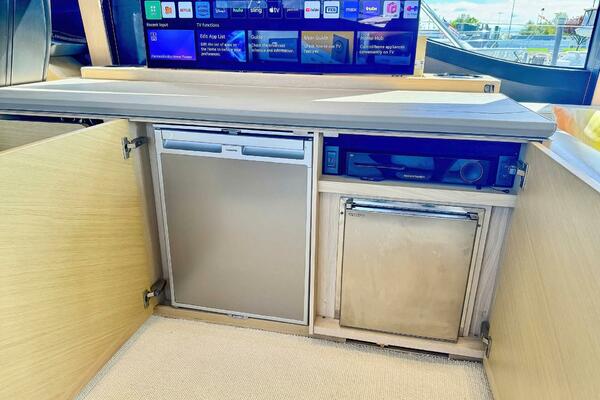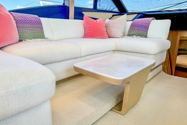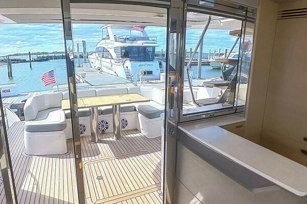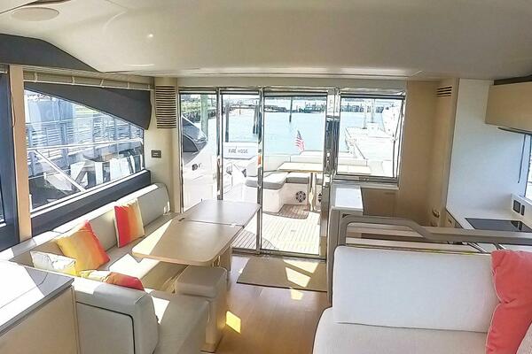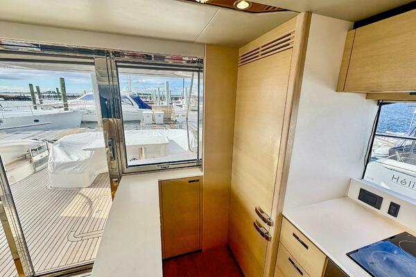 Stepping inside, the galley is strategically positioned aft to conveniently serve both interior and exterior spaces. The salon features abundant natural light through oversized windows, luxurious L and U-shaped sofas, a dedicated entertainment center with pop-up TV, and an elegant indoor dining area.