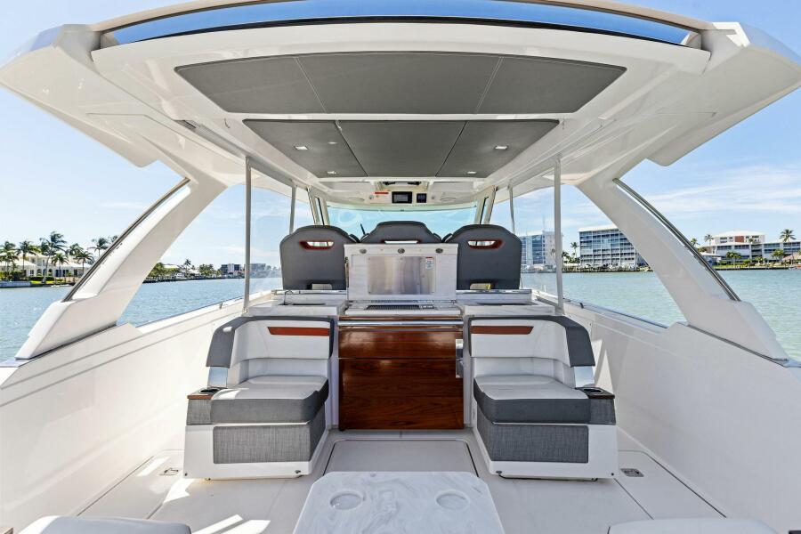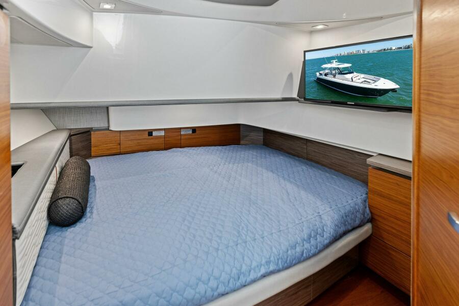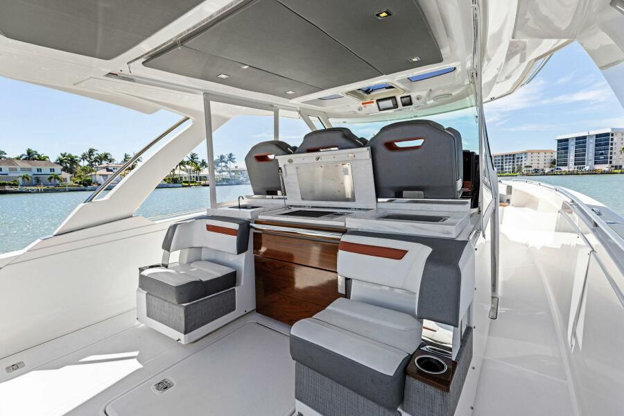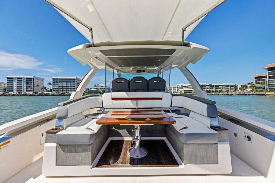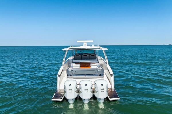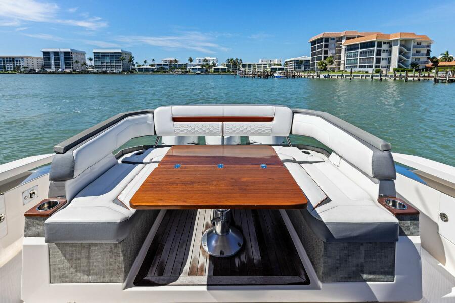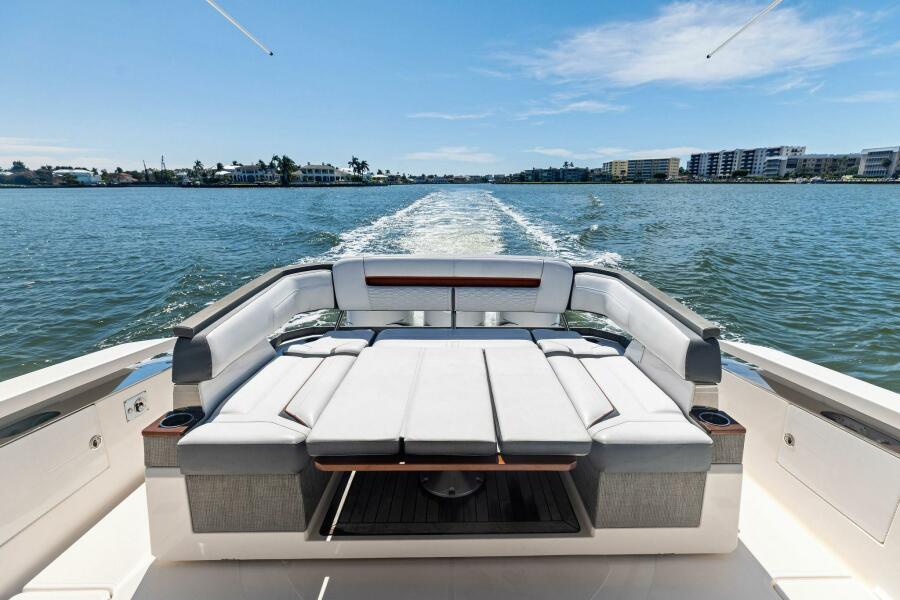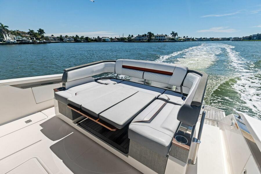 Equally impressive at rest, the 38 LS is designed to entertain in comfort and style. Features such as helm air conditioning, a manually rotating u-lounge cockpit seating module, an electric retractable aft sunshade, Mediterranean forward shade, electric grill, and premium Fusion/JL Audio sound system make her ideal for day cruising or weekend escapes. Below, the air-conditioned cabin offers a full berth, microwave, and private head with shower, providing overnight comfort in a refined setting. Every element — from the teak swim platform to the Corian countertops — reflects Tiara’s meticulous attention to detail, making this 38 LS an outstanding example of a sport-luxury cruiser.