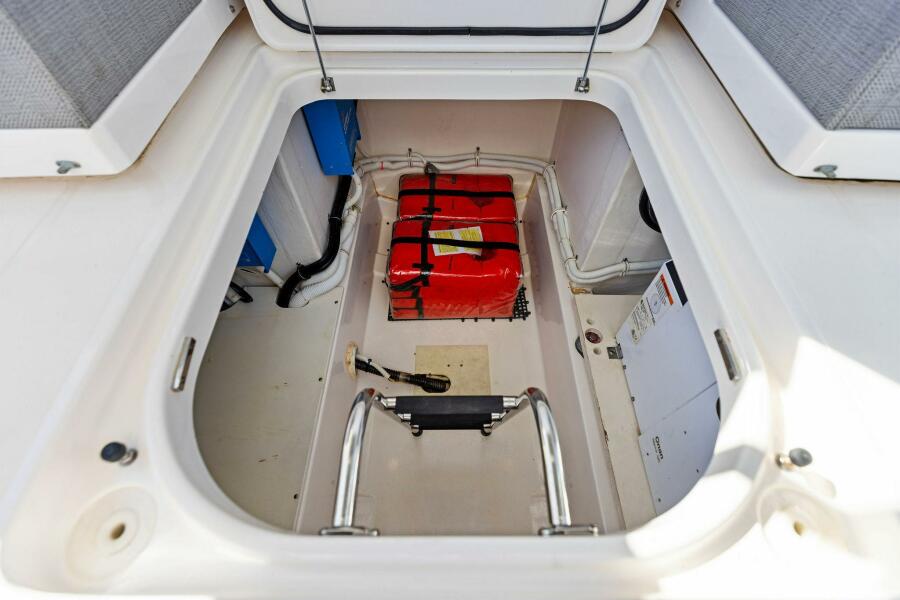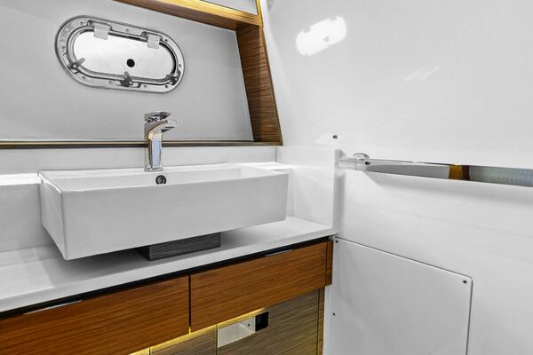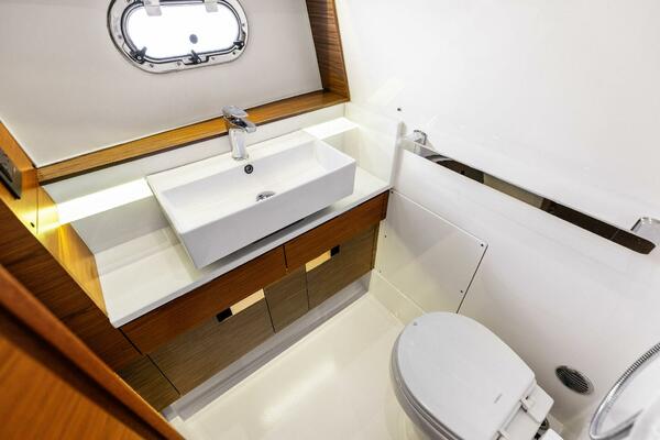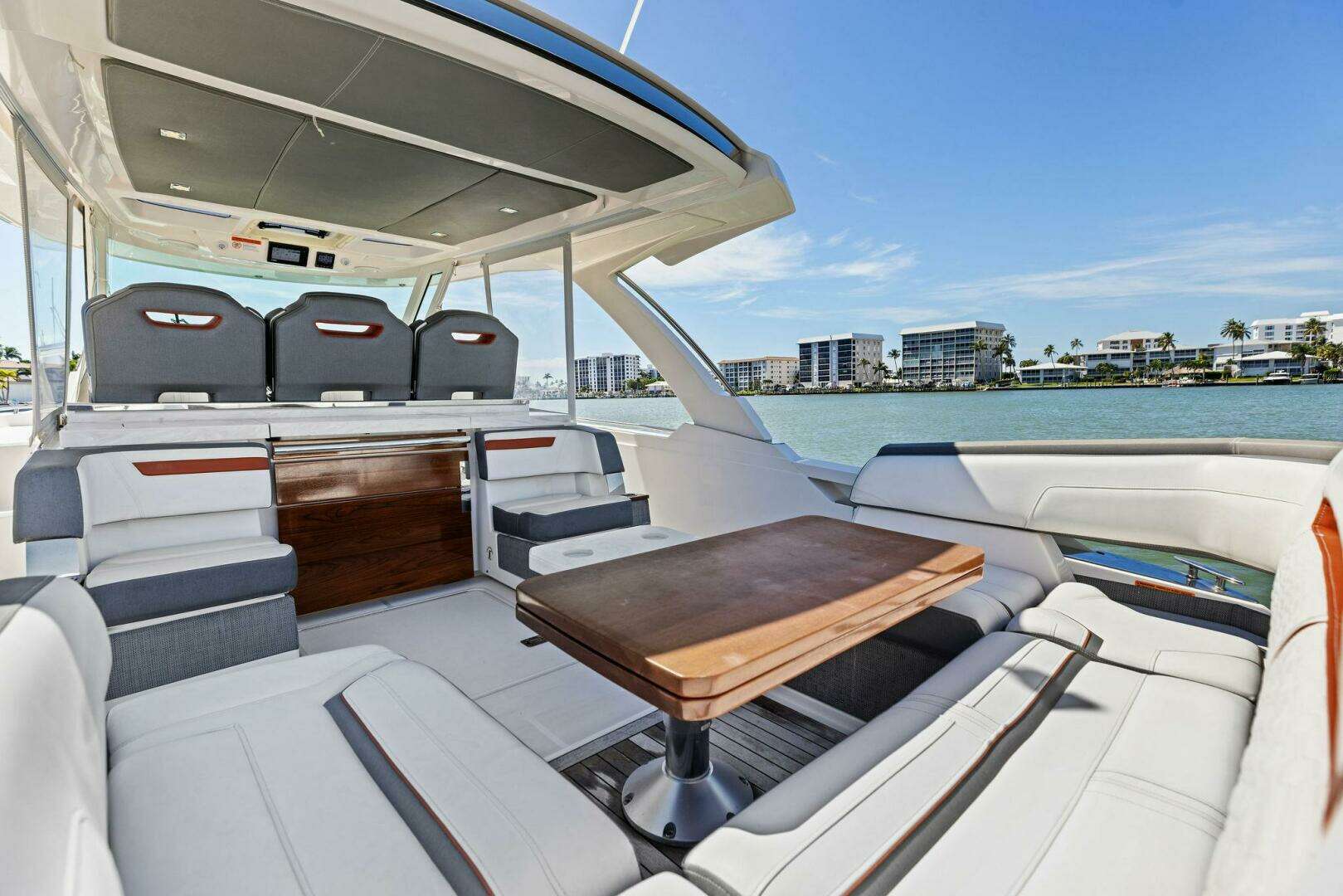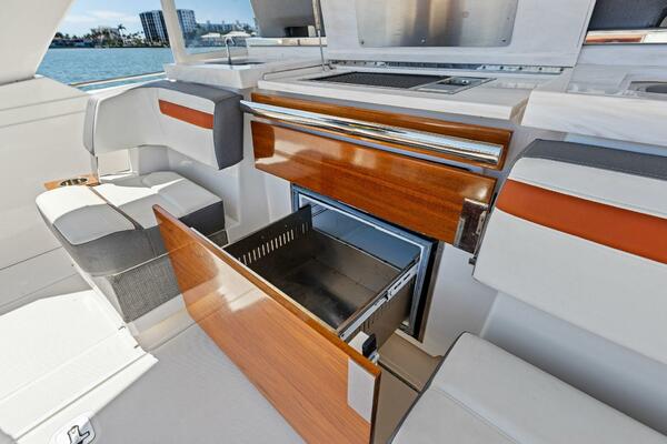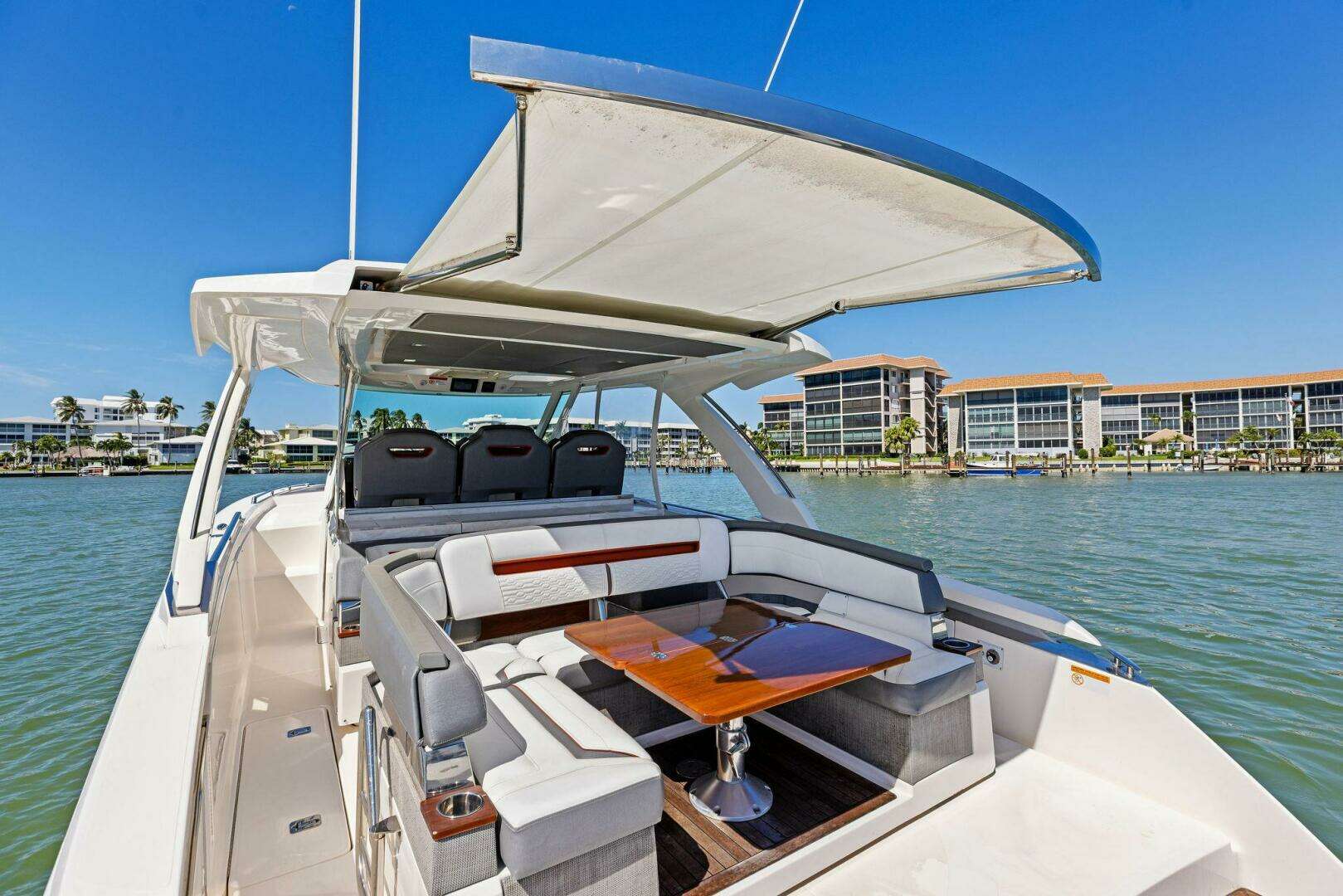 Equally impressive at rest, the 38 LS is designed to entertain in comfort and style. Features such as helm air conditioning, a manually rotating u-lounge cockpit seating module, an electric retractable aft sunshade, Mediterranean forward shade, electric grill, and premium Fusion/JL Audio sound system make her ideal for day cruising or weekend escapes. Below, the air-conditioned cabin offers a full berth, microwave, and private head with shower, providing overnight comfort in a refined setting. Every element — from the teak swim platform to the Corian countertops — reflects Tiara’s meticulous attention to detail, making this 38 LS an outstanding example of a sport-luxury cruiser.