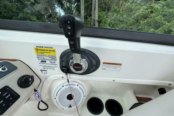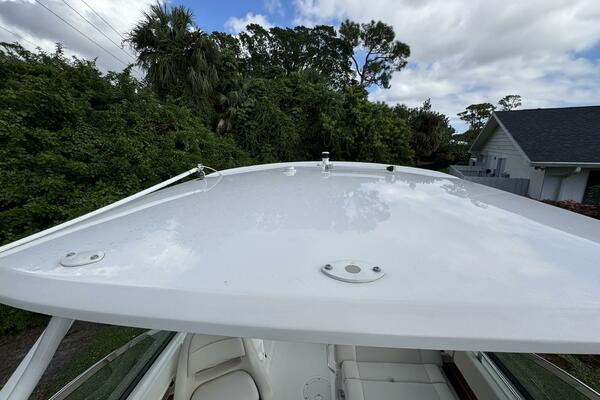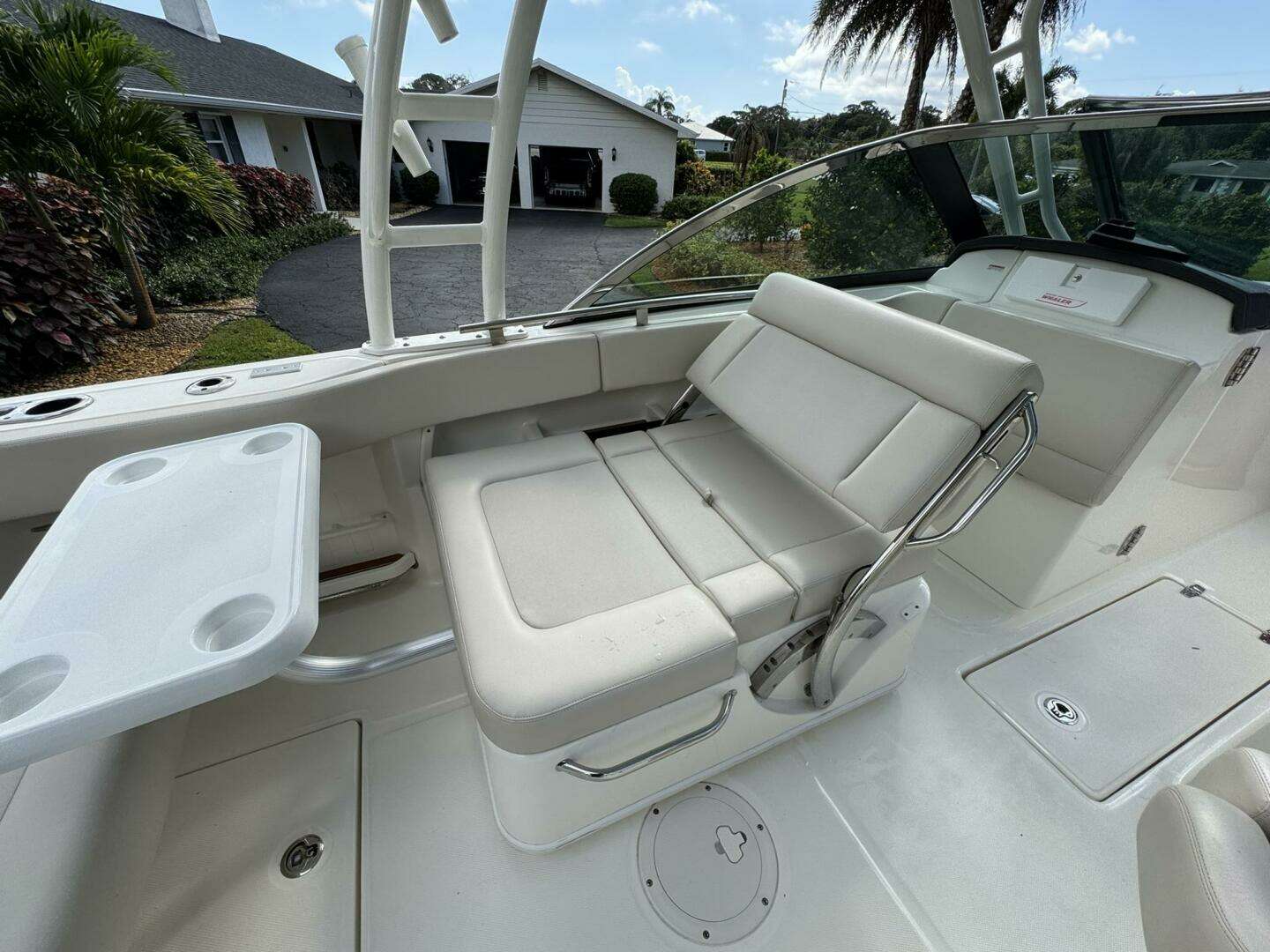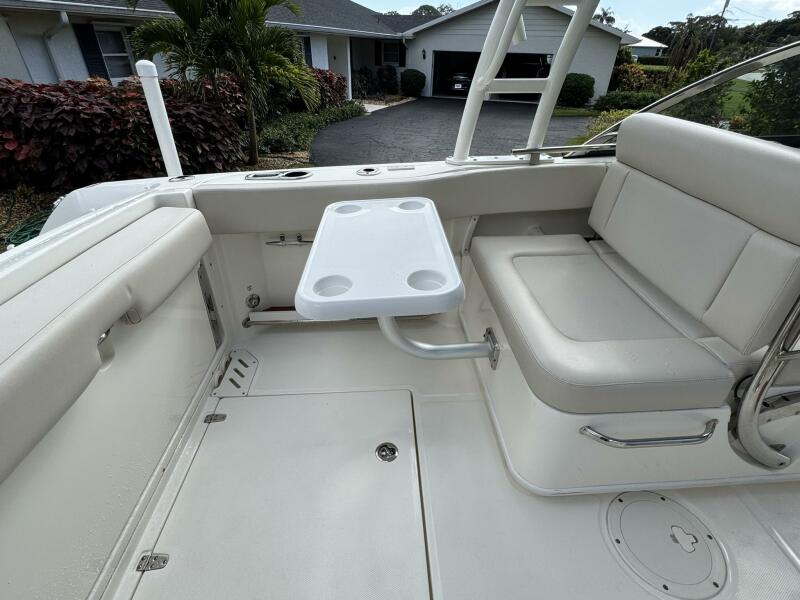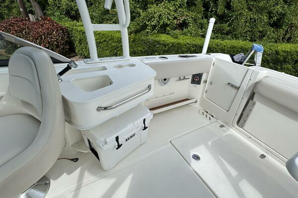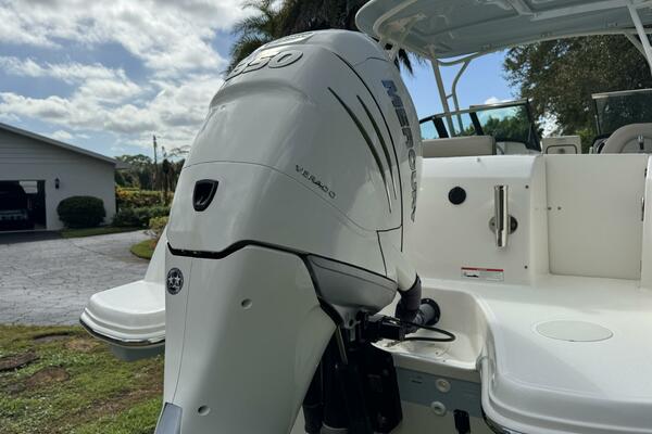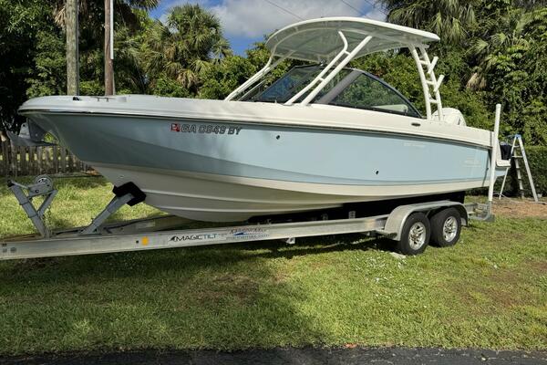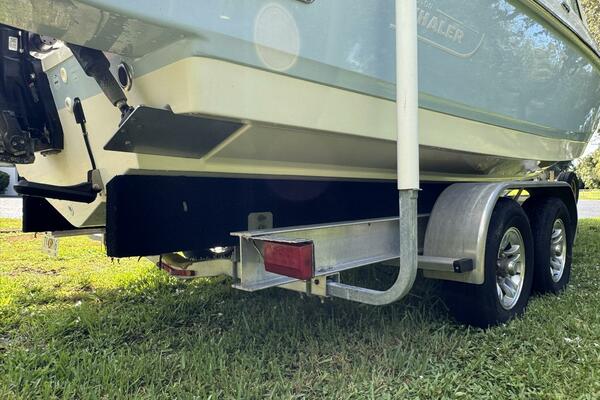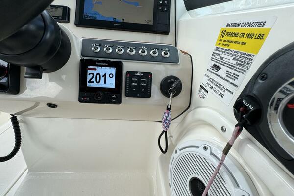 | Notable Upgrades: Mercury 350XL Engine with only 109hrs Digital Throttle and Shift Premium Audio Package- Fusion Headunit with JL Speakers Raymarine Axiom Pro 12" Chartplotter Raymarine Ray52VHF Raymarine Autopilot Anchor Windlass Battery Charging System (plug in transom) Corian Countertop at Utility Center with Stainless Steel Rail Fishing Package- 14 Gallon Livewell, Raw Water Washdown, Stainless Steel Toe Rails w/Under Gunnel Storage Shelf, Stainless Steel Transom Mounted Rod Holders Freshwater Shower- Bow and Stern Sprayers Hardtop w/gelcoat- Hardtop Underside Matches Hull Color Light Blue White Rub Rail with Stainless Steel Insert Seating- Bow Filler Cushion Table- Bow Table with Dedicated Storage, also works in Cockpit Trailer- Aluminum with disc brakes Windshield Cap-Stainless Steel Blue Canvas Covers Bow and Cockpit Snap On Light Blue Hull Color |