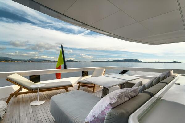 | Exceptional deck spaces, including jacuzzi foredeck, expansive lounges, and wide swim platform. |