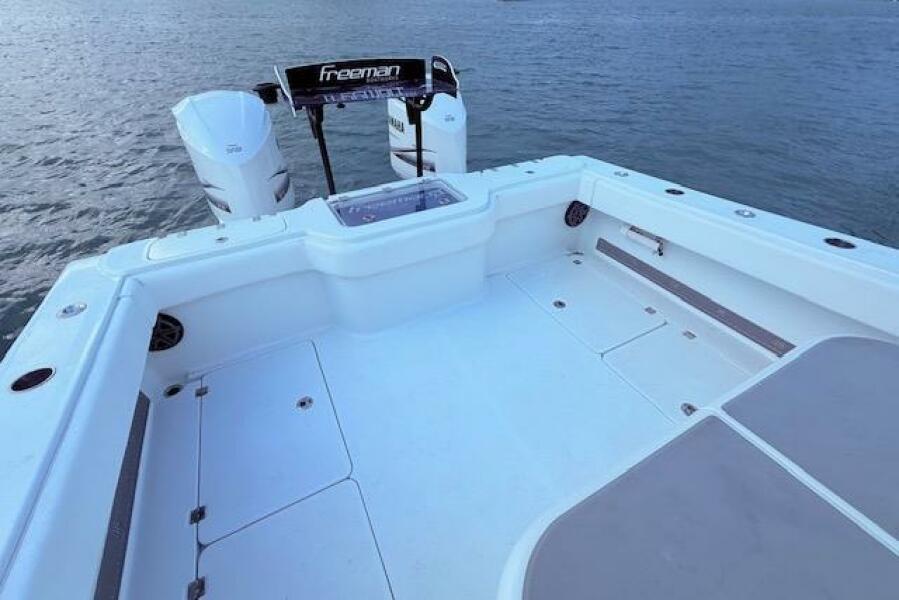 Freeman 34 boat deck, 2019 model, with dual engines on calm water.