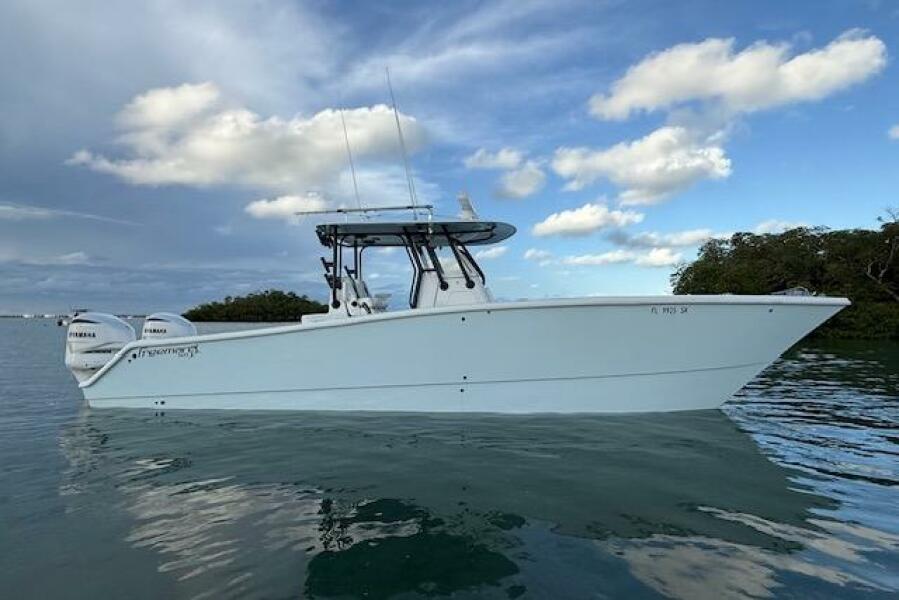 2019 Freeman 34 boat on water with Yamaha engines, under a partly cloudy sky.