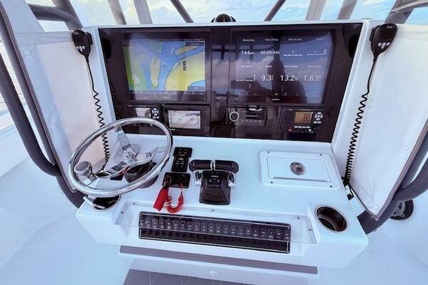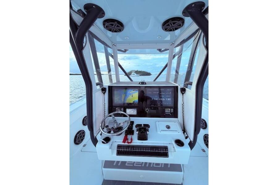 Helm of 2019 Freeman 34 boat with navigation screens and controls.