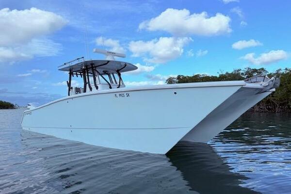2019 Freeman 34 boat on calm water near mangroves, featuring a sleek design and modern console.