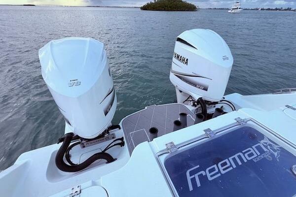 2019 Freeman 34 boat with twin Yamaha V8 350 outboard engines on water.