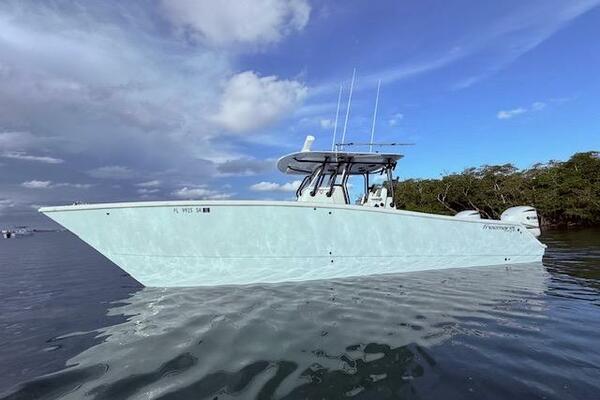 2019 Freeman 34 boat deck with center console, under a cloudy sky.