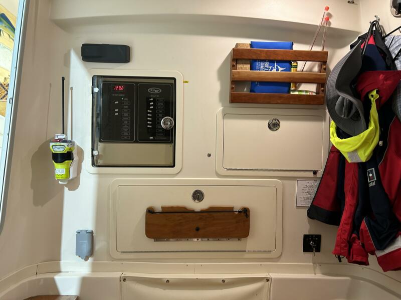 - Head - lockable console w/stand up head area, shower, sink, drawers & VacuFlush(R) head, 10-gallon holding tank and pump out