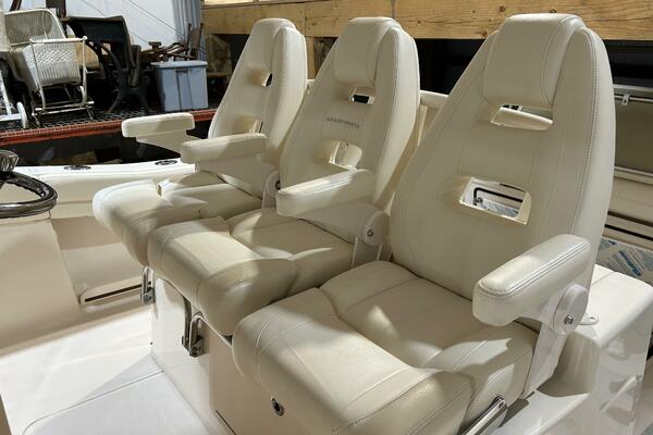 - Lean bar mounted Command Elite horizontally adjustable contoured helm chairs w/deluxe cushioning & flip-up bolsters (3)