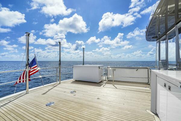 The aft area of the flybridge is versatile and open. The upgraded telescoping davit can accommodate toys like jet skis and Seabobs. This area can be set up with a custom Release Marine table and chairs for dining or cocktails. These can be stowed away when not in use in the custom storage solution. The aft area also includes a stainless steel grill and is shaded by Pipe Welders sail shades, creating a perfect space for outdoor entertaining.
