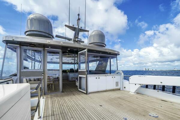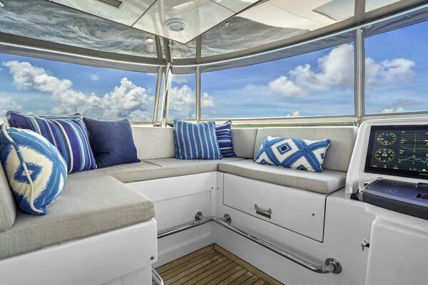 The flybridge is accessible via a custom interior stairway with an electric sliding door from the salon, or through the stairwell from the aft deck. Although it is an open‐bridge model, the flybridge features a custom enclosure, providing the best of both worlds. Whether you prefer the open air or the comfort of 48,000 BTU air‐conditioning, the bridge deck offers flexibility. The enclosure maintains an open‐bridge feel without restricting visibility and allows the side curtains to be pinned up against the hardtop for a true open‐ air experience. Forward to port, the flybridge offers a U‐shaped seating area raised 5 inches for improved visibility while cruising. The helm is forward to starboard, equipped with two Stidd helm chairs.Just aft of the seating, a built‐in cabinet to port houses a custom cooler connected to an Eskimo ice machine with exceptional output. To starboard, behind the helm chairs, there is a cabinet with a sink and three drink fridges. Further aft, you'll find a large L‐shaped built‐in couch with storage underneath, accompanied by two Release Marine cocktail tables. To port, a dining table for eight is available, with a dropdown TV integrated into the hardtop. All audiovisual systems are controlled via Crestron iPad controls. For docking, both port and starboard sides of the flybridge feature wing stations, each with bow and stern thruster controls, CAT360 joystick control, and throttles for precise maneuvering and excellent visibility.