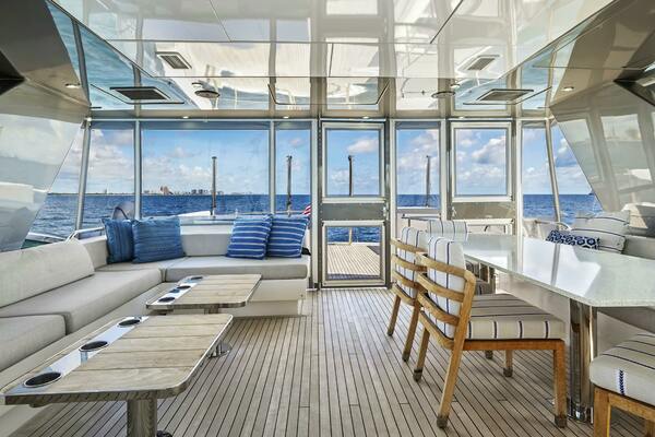 The exterior is designed for entertaining, featuring an aft deck with alfresco dining, a foredeck with a sun pad and recessed dining table and seating, and a spacious and versatile flybridge, open-air and fully enclosed areas, with multiple seating and dining options.