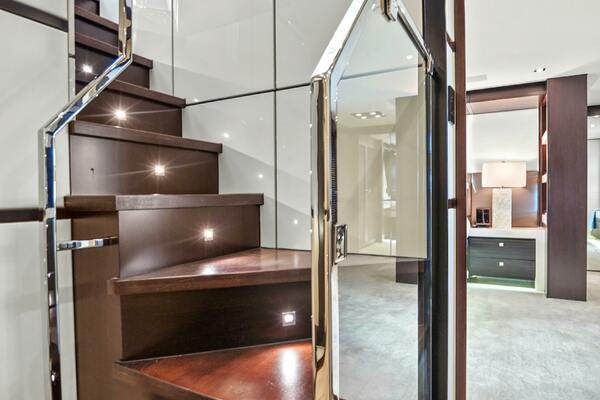 The master stateroom, located midship and aft, boasts an impressive amount of space, offering significantly more volume than previous Hatteras 90 Panacera builds, with an additional 22 inches both forward and aft. The centerpiece is a king‐size bed with storage underneath, operated by an electric‐powered actuator. To the port side, beneath the window, there's a custom single bed that doubles as a couch or lounge area, perfect for relaxing, reading, or providing an extra bed for children. The thoughtful design extends to the starboard side, where built‐in drawers provide ample storage, and dual closets are located aft and to port. The ensuite bathroom is equally luxurious, featuring heated floors, a large double vanity, and a spacious walk‐in shower. Just outside the master lies the custom coffee bar, it holds a drink fridge below, room for a coffee machine on the counter top and glassware storage above.