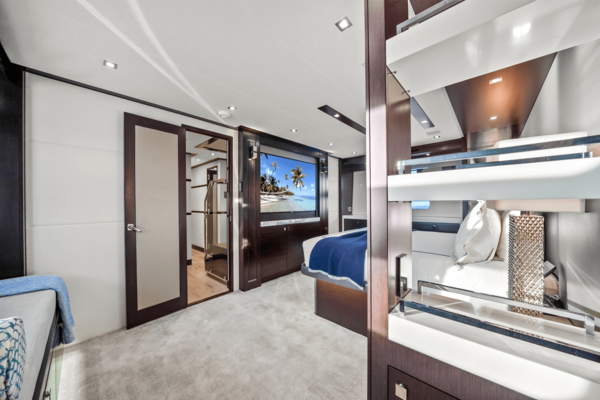 The M90 Panacera features a country kitchen layout with an inviting galley suited for owner use and enjoyement and four staterooms (all down). The port side salon opens to a custom balcony with triple sliding glass doors, creating a seamless connection between indoor and outdoor spaces. Other standout features include dual water makers, zero speed fin stabilization (hydraulic), and hydraulic bow and stern thrusters. iPad controls manage lighting, entertainment, and electric blinds, enhancing comfort and convenience. Boat is located off site, call to schedule showings.