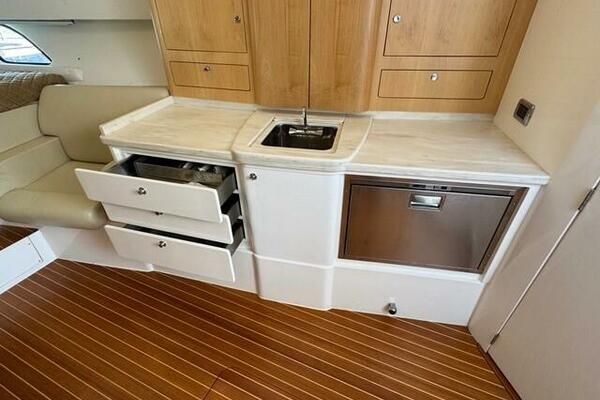 Onboard, the layout is exceptionally versatile. The helm features seating for two with excellent visibility, while the expansive cockpit and wraparound seating create a great space for entertaining family and friends. Below, the cabin offers comfortable accommodations for up to four overnight guests with premium finishes throughout. With serious fishing features, refined cruising comfort, and all-around versatility, SAGA is designed for the way people actually use their boats-she does it all and does it well.