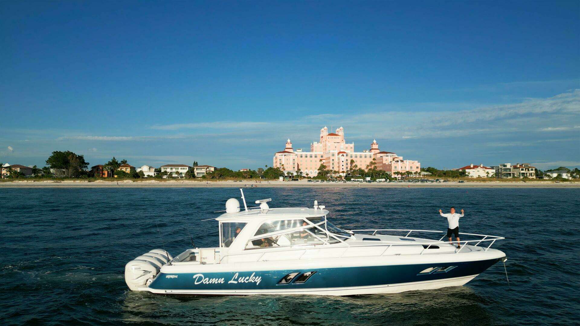 2019 47 Intrepid Sport Yacht featured on ‘Wandering Bostonian’ TV Show, picture with The Don Cesar is for sale. Step aboard “DAMN LUCKY”, this impeccably maintained 2019 Intrepid 475 Sport Yacht – a premier blend of cutting-edge performance, versatile functionality, and luxurious comfort. Renowned for its sleek design and superior craftsmanship, this vessel is powered by quad 425 Yamaha engines and fully equipped with high-end electronics, custom upgrades, and spacious accommodations. Whether you’re chasing adventure offshore or cruising in comfort, this Intrepid 475 is turnkey ready and built to impress even the most discerning boater.