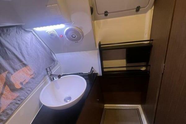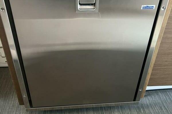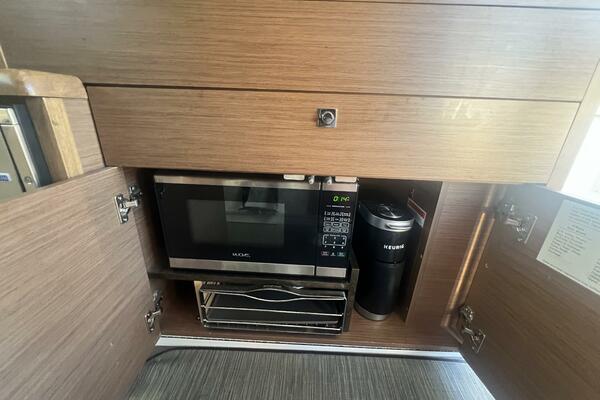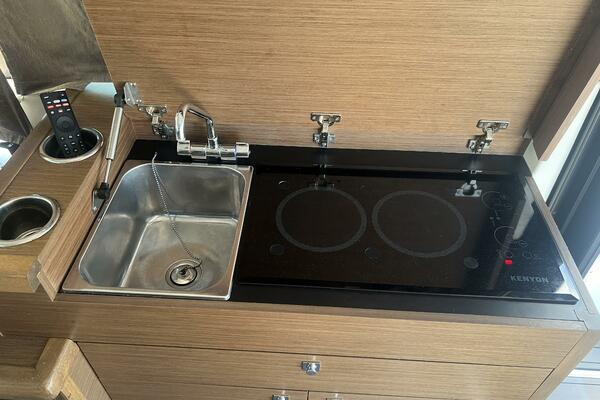 - Well-equipped galley with refrigerator, sink, cooktop, and storage