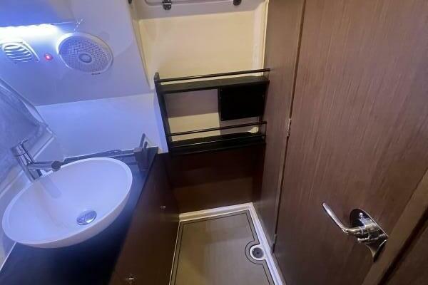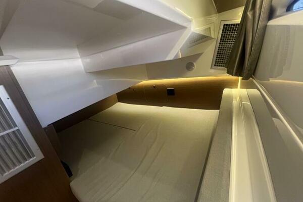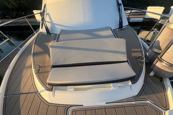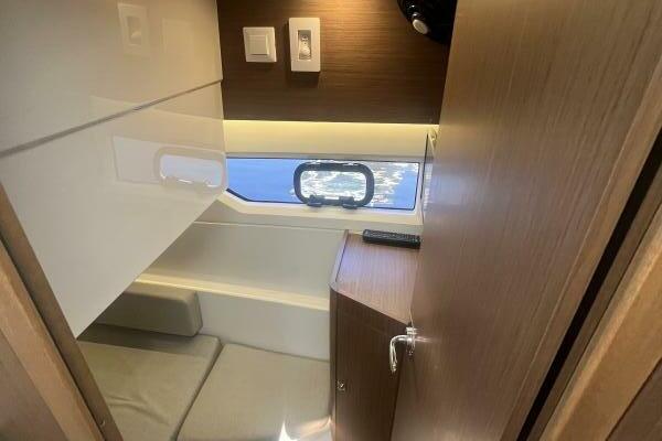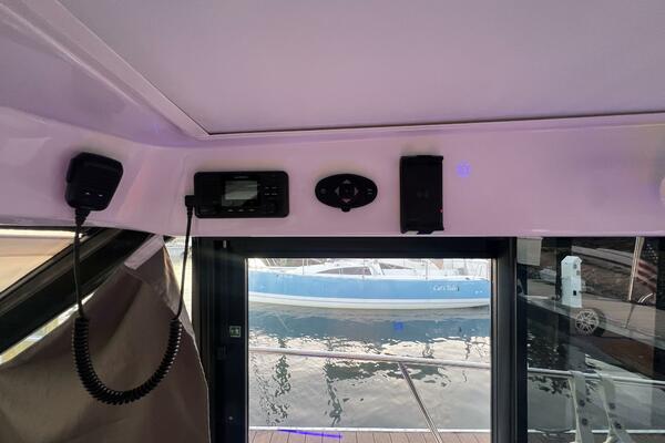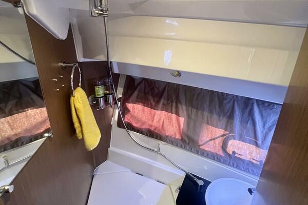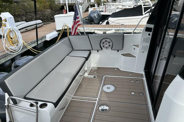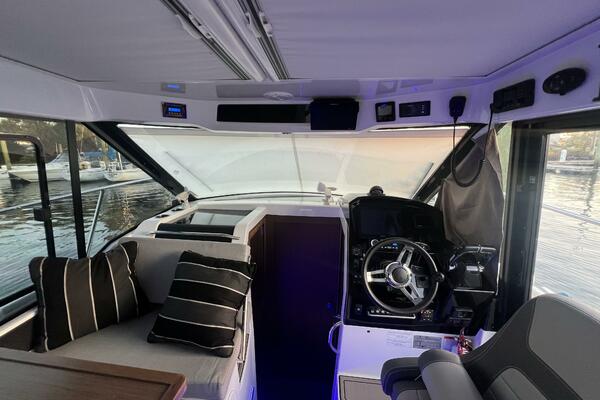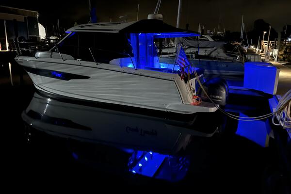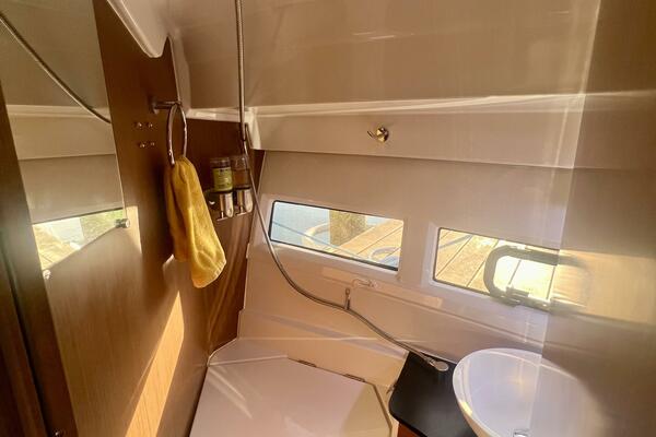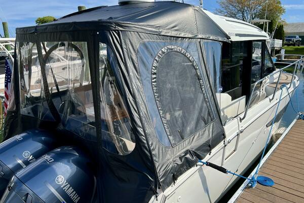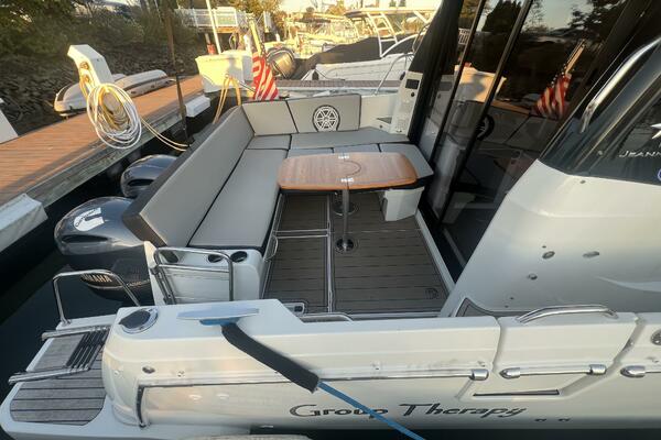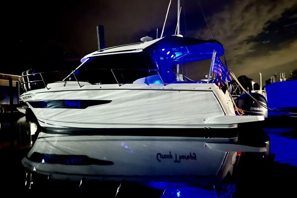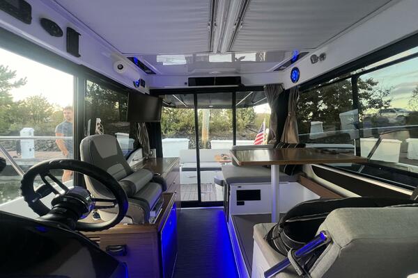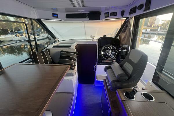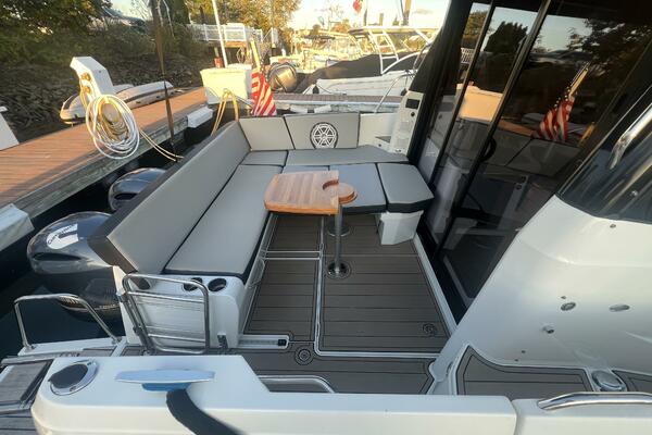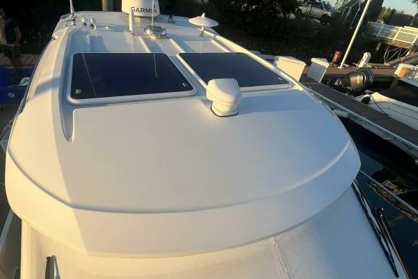 Powered by reliable twin outboards, she boasts a quiet, efficient ride and easy handling. Her thoughtfully designed layout includes two private cabins, a full head with shower, and a bright, airy salon with wraparound windows and seamless indoor-outdoor flow. The sliding side door, full walkaround decks, and generous cockpit seating make her ideal for both solo handling and entertaining.