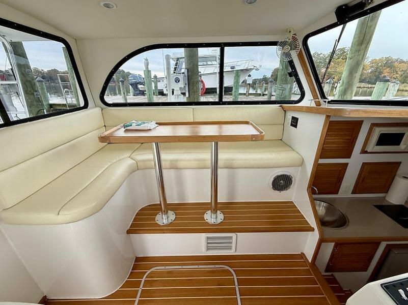 Entering the cabin from the cockpit there is a L-shaped settee to port and the Main helm station to starboard.