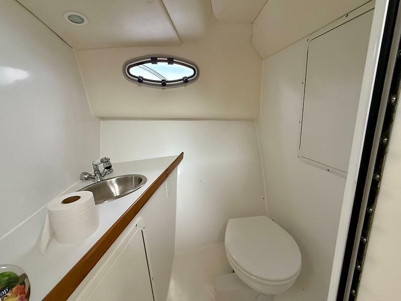 Going forward and down 2 steps the galley is to port and enclosed head to starboard. All the way forward is a la large V-berth that sleeps 2.